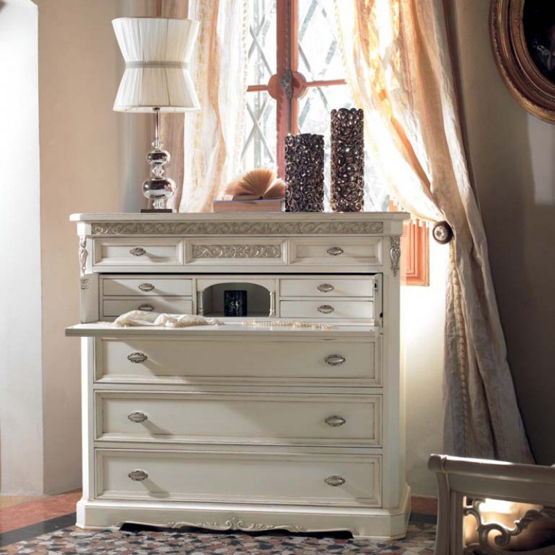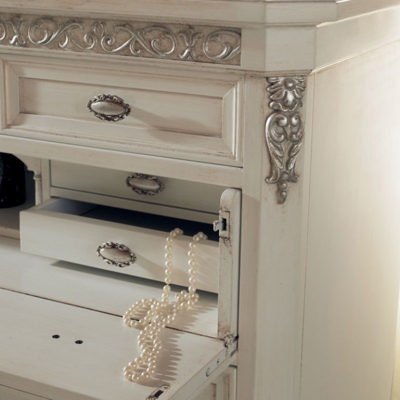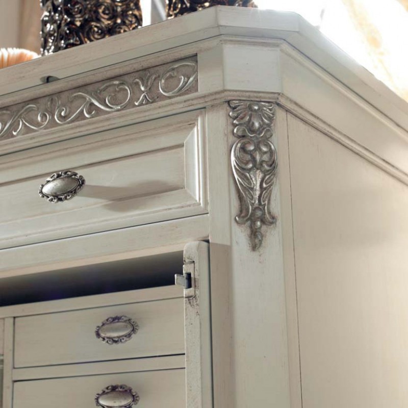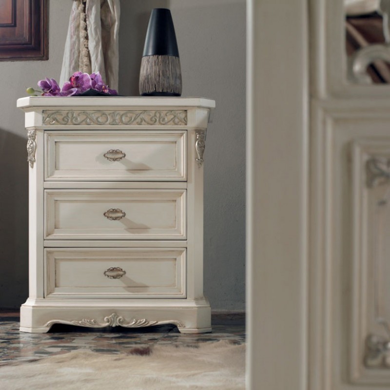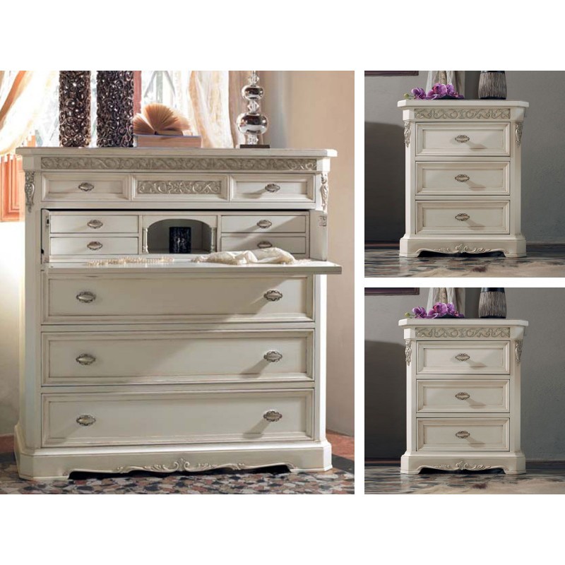 Gruppo completo di comò e comodini dallo stile classico veneziano caratterizzati da decori intagliati con applicazioni in foglia oro e argento manualmente eseguiti da mani di esperti artigiani. Composto da un comò con un piano estraibile e da un vano segreto composto da 4 cassettini all'interno e un vano a giorno accompagnato da due comodini a 3 cassetti per disporre biancheria e indumenti ideali per la zona notte. Apprezzerai questi mobili per le sue linee e le sue forme che si contraddistinguono per il suo design d'altri tempi , creando un'atmosfera romantica e originale .