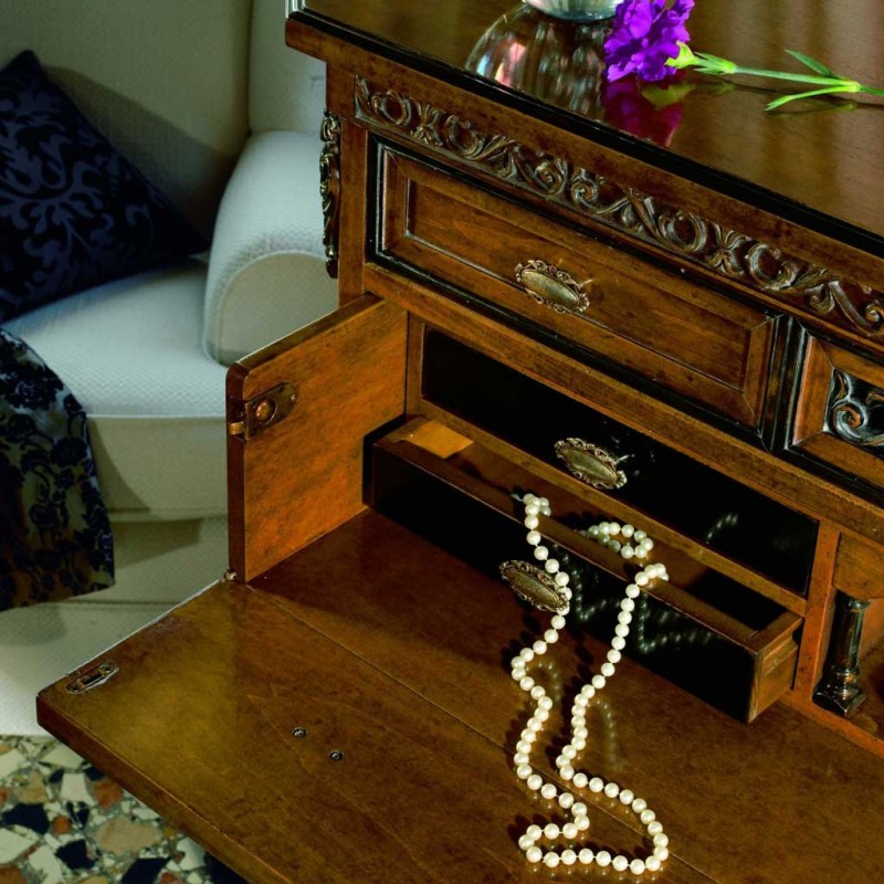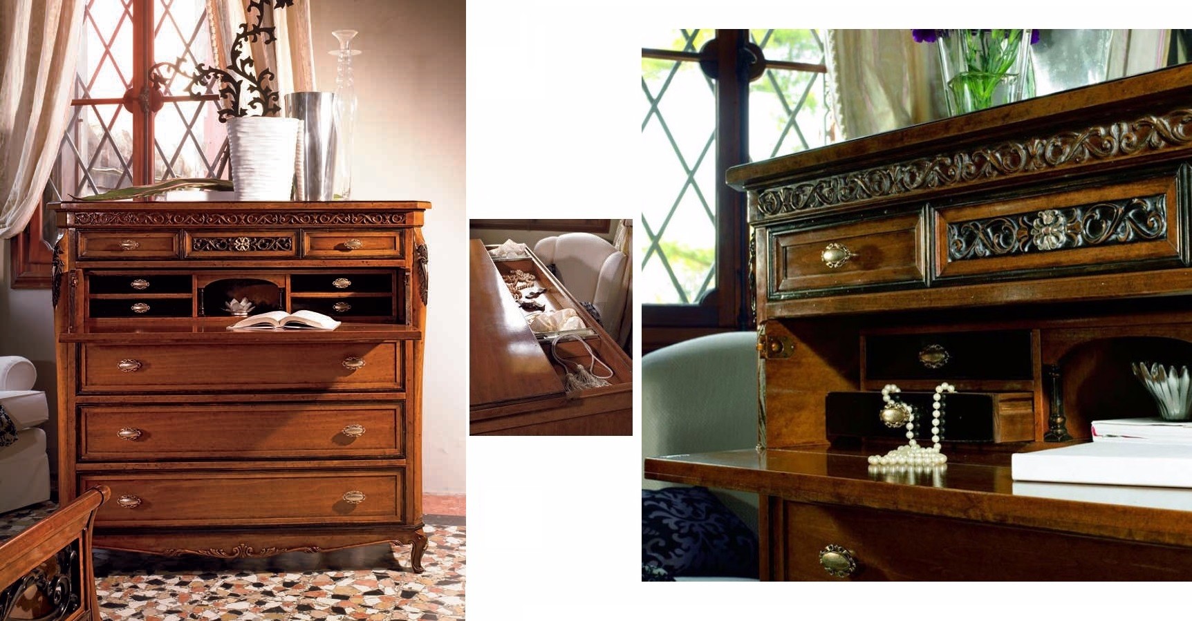 Cassettiera dallo stile classico veneziano caratterizzata da decori intagliati applicati manualmente da mani di esperti artigiani. Composta da un piano estraibile e da un vano a giorno centrale ornato da due colonnine tornite affiancate da 4 cassettini, invece nella parte inferiore troviamo 3 cassettoni per riporre biancheria e indumenti. Apprezzerai questo mobile per le sue linee e le sue forme che si contraddistinguono per il suo design d'altri tempi, creando un'atmosfera romantica e originale .