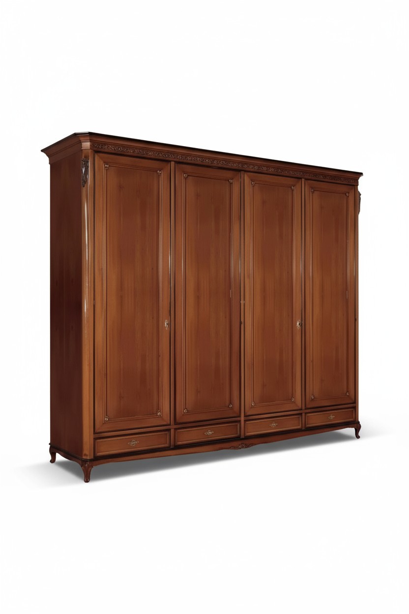 Cerchi un arredo imponente e raffinato per completare con stile la tua zona notte? Dai un’occhiata a questo meraviglioso armadio 4 ante con gambe a sciabola e applicazioni intagliate!