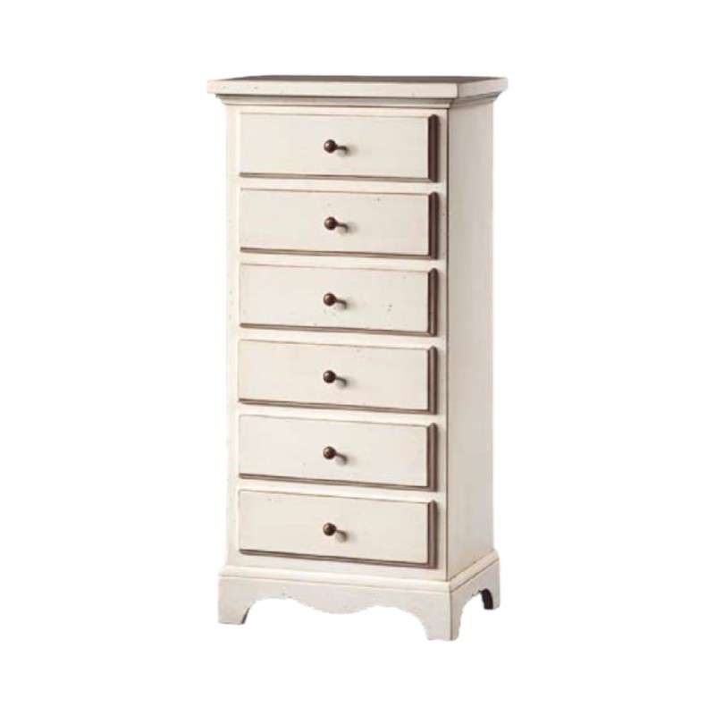 Cassettiera dalle linee semplici e pulite costruita in legno con zoccolo a terra sagomato. Cassettiera dotata di sei cassetti per riporre all'occorrenza biancheria intima e oggetti. Trovano facilmente posto nella zona notte proteggendo con i suoi cassetti il suo contenuto all'interno. Unica nel suo genere grazie alle sue linee eleganti dando un tocco a un' atmosfera dallo stile shabby chic.