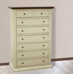 Cassettiera dalle linee semplici e pulite costruita in legno con zoccolo a terra. Cassettiera dotata di sei cassetti e due cassettini per riporre all'occorrenza biancheria intima e oggetti. Trovano facilmente posto nella zona notte proteggendo con i suoi cassetti il suo contenuto all'interno. Unica nel suo genere grazie alle sue linee eleganti dando un tocco a un' atmosfera dallo stile shabby.