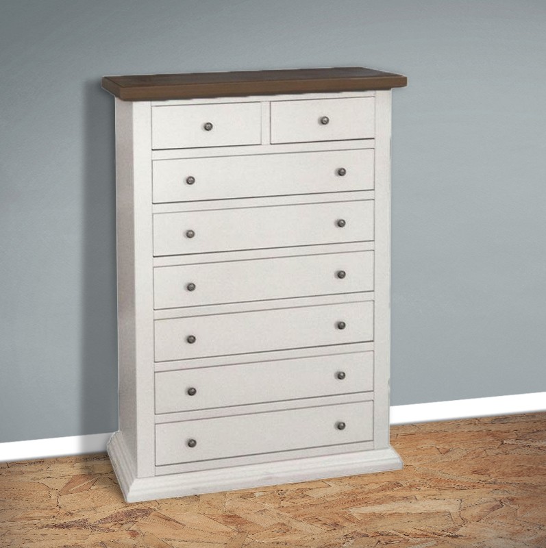 Cassettiera dalle linee semplici e pulite costruita in legno con zoccolo a terra. Cassettiera dotata di sei cassetti e due cassettini per riporre all'occorrenza biancheria intima e oggetti. Trovano facilmente posto nella zona notte proteggendo con i suoi cassetti il suo contenuto all'interno. Unica nel suo genere grazie alle sue linee eleganti dando un tocco a un' atmosfera dallo stile shabby.