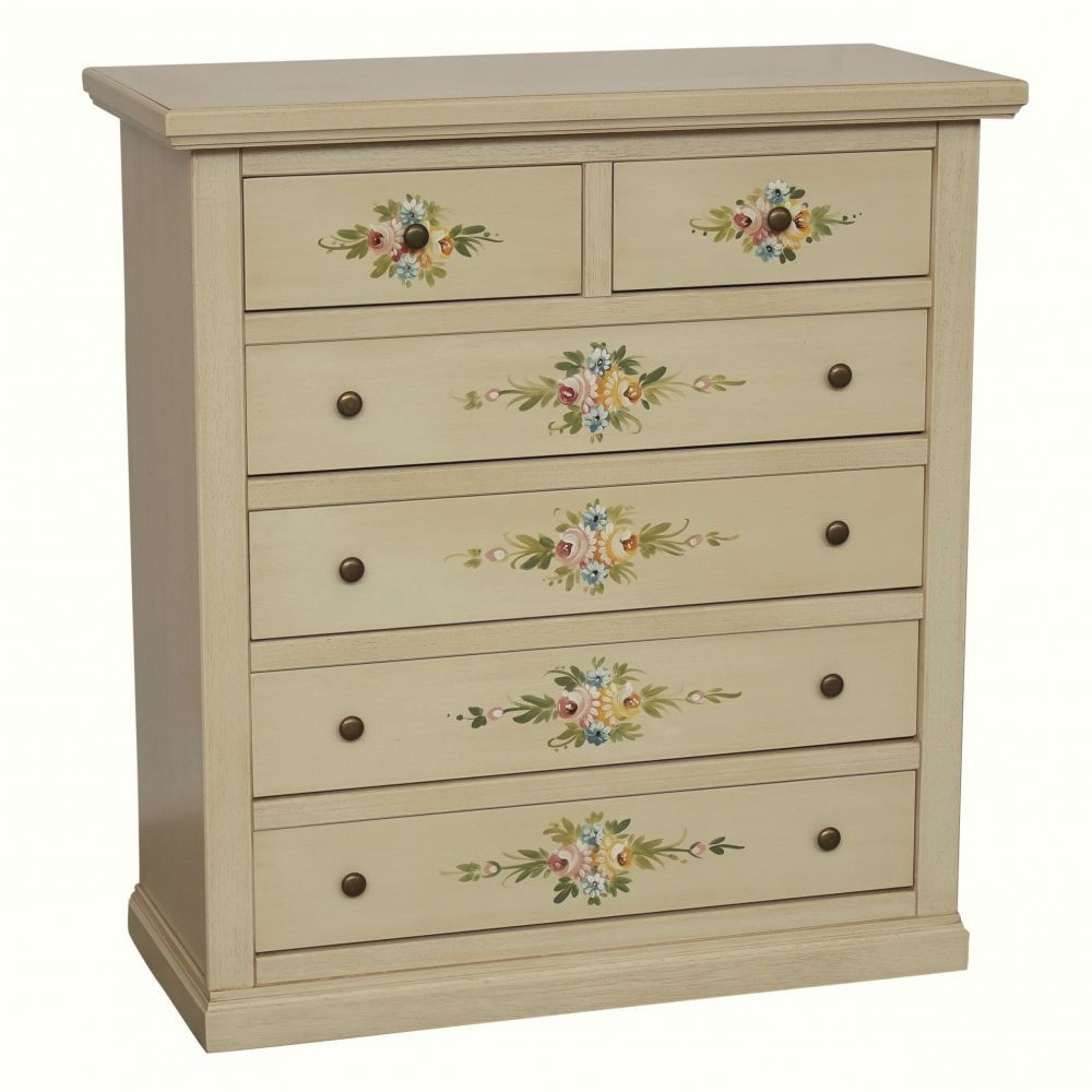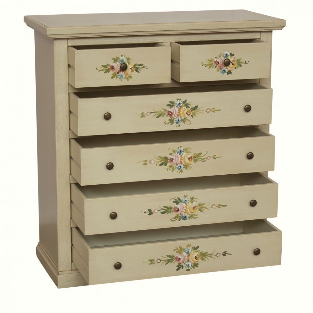 Cassettiera 6 cassetti in legno shabby avorio anticato decorato 86x40X96