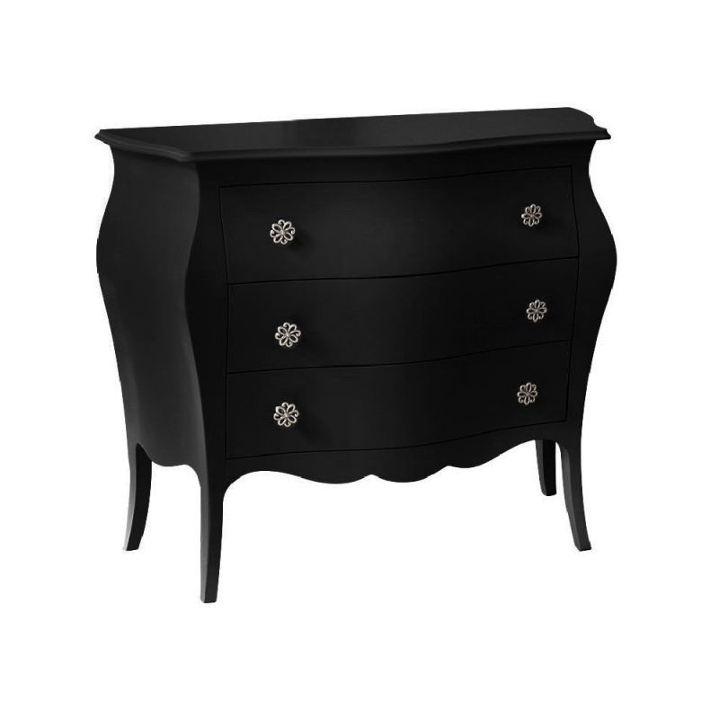 Cassettiera sagomata costruita in legno con gambe a sciabola. Cassettiera dotata di tre cassetti per riporre all'occorrenza biancheria intima e oggetti. Trovano facilmente posto nella zona notte proteggendo con i suoi cassetti il suo contenuto all'interno. Unica nel suo genere con la sua particolare laccatura nero opaco e le sue maniglie colore argento dando un tocco a un' atmosfera dallo stile unico e originale .
