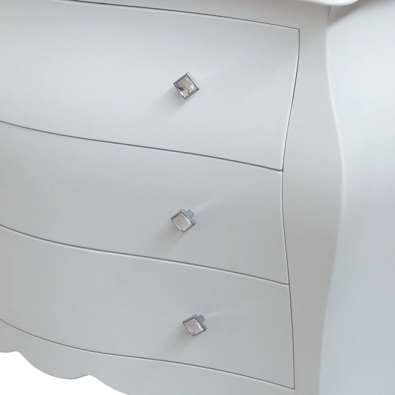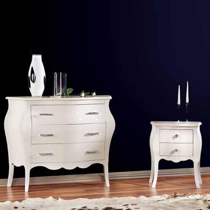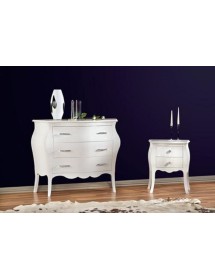 Gruppo cassettiera e Comodini costruiti in legno con angoli smussati e gambe a sciabola. Cassettiera e comodini dotati di cassetti per riporre all'occorrenza biancheria intima e oggetti. Trovano facilmente posto nella zona notte proteggendo con i suoi cassetti il suo contenuto all'interno. Unici nel loro genere con i pomoli swarovski dando un tocco a un' atmosfera dallo stile romantico.