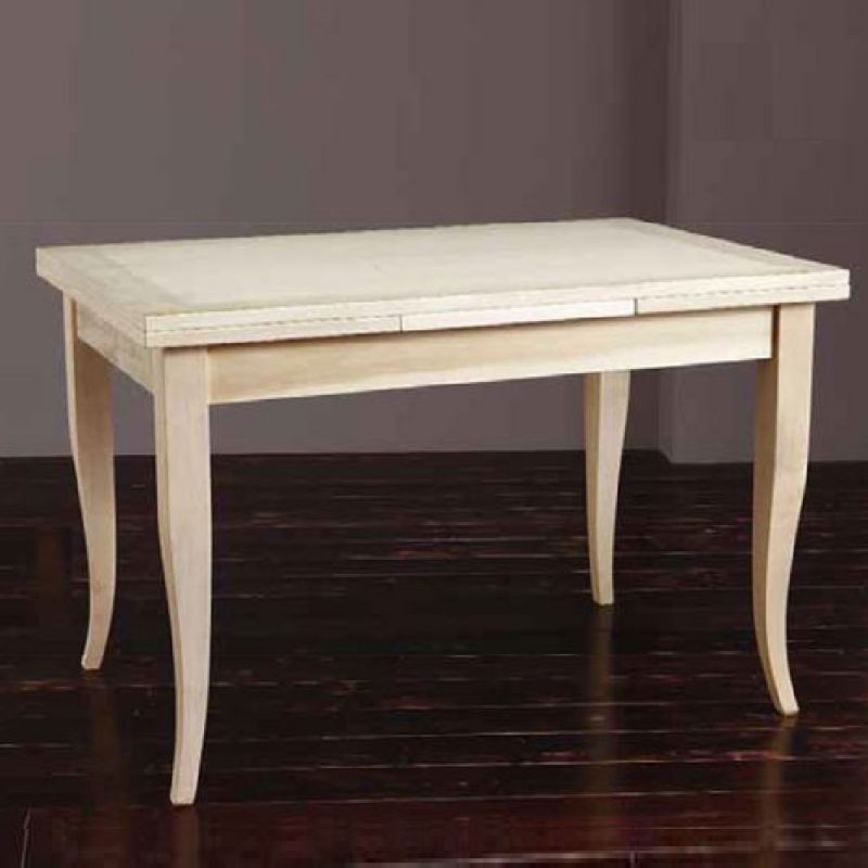 Tavolo costruito in legno massello rendendo il mobile solido e allo stesso tempo elegante. Piano rettangolare con gambe a sciabola. Dotato di due allunghe da 40 cm allungabile con apertura laterale da entrambi i lati, detta anche "apertura a tiro", le allunghe sono riposte sotto il piano. Ideale per il soggiorno o in cucina.