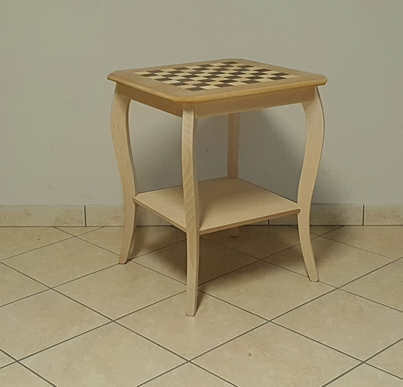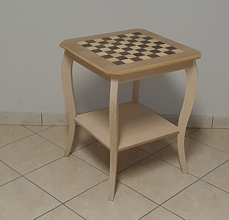 Tavolino costruito in legno massello rendendo il mobile solido e allo stesso tempo elegante. Piano quadrato con scacchiera e con ripiano sottostante tra le quattro gambe sagomate. Ideale per il soggiorno o come complemento di arredo da inserire in qualsiasi stanza della casa.