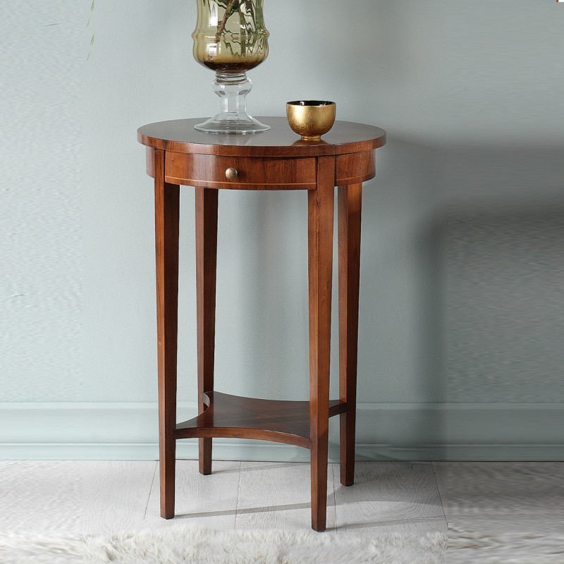 Tavolino costruito in legno massello rendendo il mobile solido e allo stesso tempo elegante. Piano rotondo con 1 cassetto e con un ripiano sottostante situato tra le gambe. Ideale per il soggiorno o in cucina o per contract: ristoranti, agriturismi, bar , trattoria, pizzeria e esercizi pubblici.