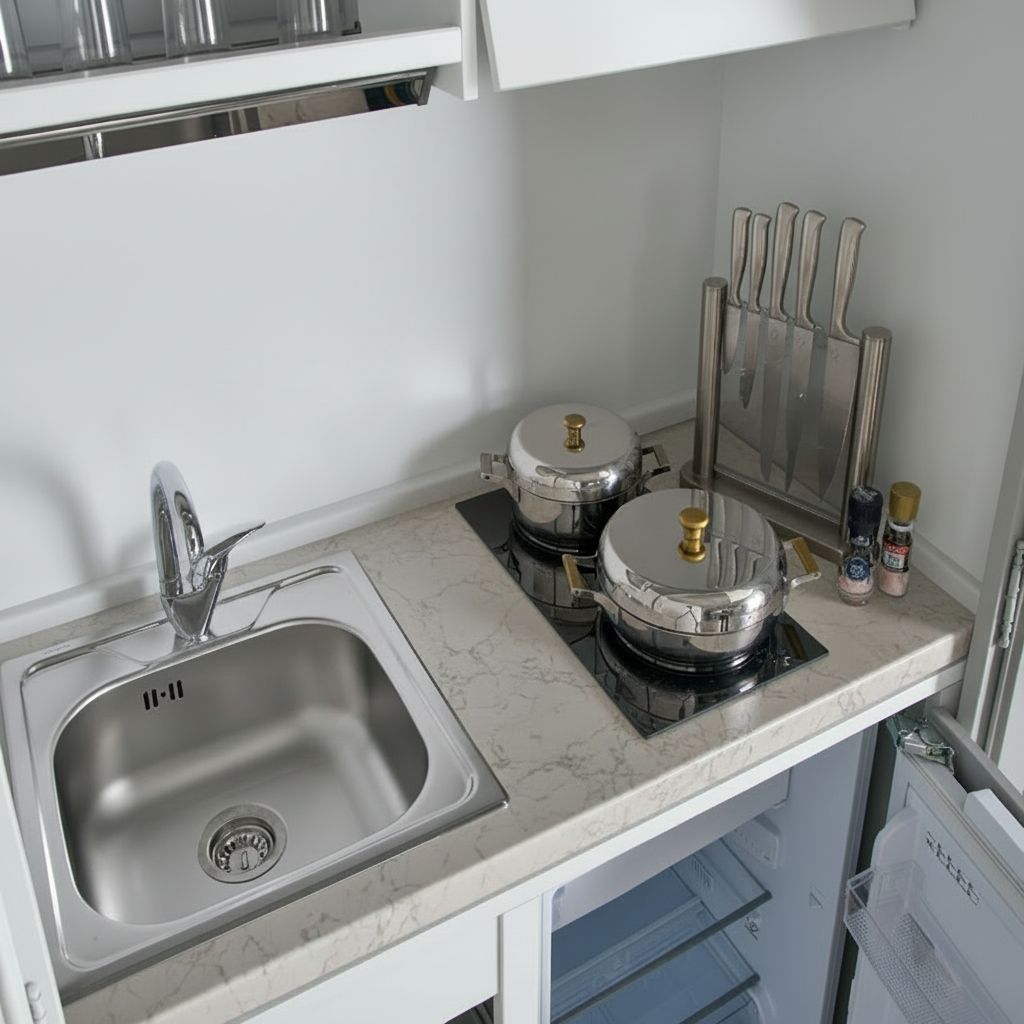 NEL KIT ELETTRODOMESTICI DA ACQUISTARE A PARTE E' COMPRESO DI: 1 FRIGO - 1 PIANO IN LAMINATO TIPO MARMO VENATO SPESSORE 4 CM CON LAVELLO E PIANO COTTURA A INDUZIONE - 1 MISCELATORE- 1 MOTORE CAPPA -1 SET SCOLAPIATTI GRIGLIE INOX.