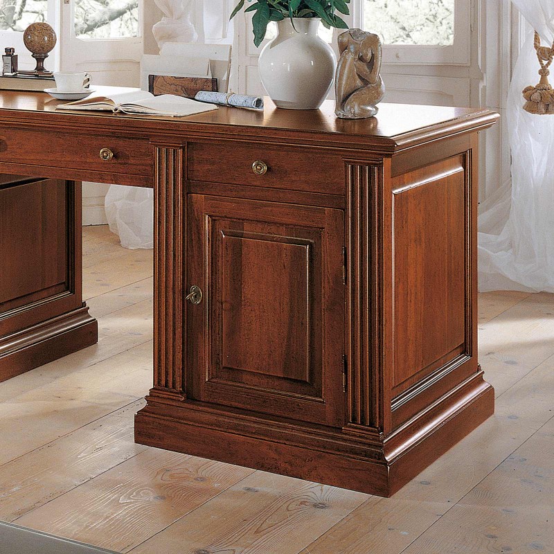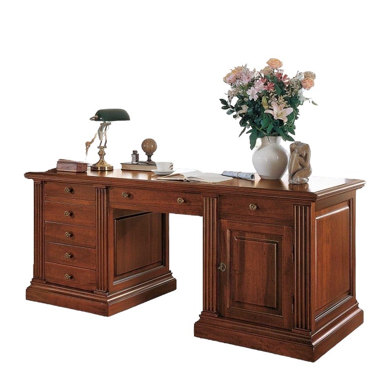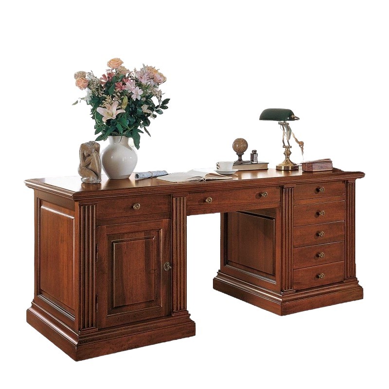 Scrivania costruita in legno massello con zoccolo a terra dotata di 7 cassetti e 1 porta che ti permetteranno di custodire oggetti in maniera sicura, piano della scrivania che offre lo spazio necessario per tenere in ordine i documenti e la cancelleria. Unica nel suo genere per la sua verniciatura in contrasto con gli intagli che non passeranno inosservate da amici o parenti. Ideale per il tuo luogo lavoro o di studio dove trascorrere il tempo per impegni lavorativi o di studio..