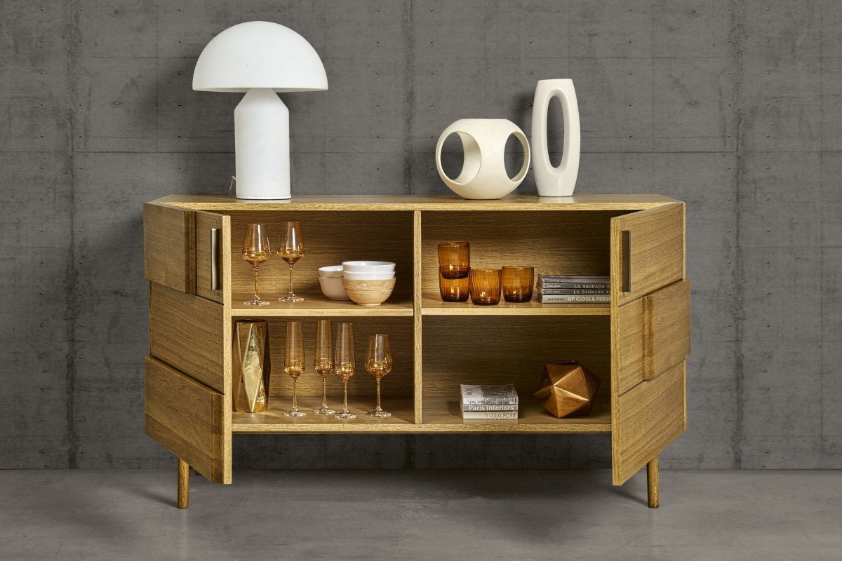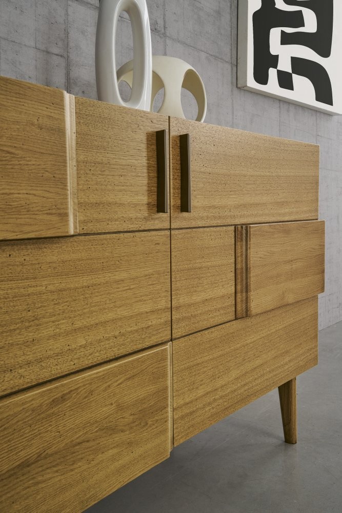 Credenza in stile contemporaneo adatta per inserire oggetti di varie dimensioni, funzionale e spaziosa che ti permetterà di risolvere i problemi di spazio grazie ai suoi 2 porte con la chiusura rallentata. Elemento di arredo che conferisce un tocco di raffinatezza e calore grazie alla sua eleganza intramontabile che solo il rovere può offrire. L'elemento centrale di questa collezione è sicuramente il pannello sagomato applicato sui cassetti per creare un gioco armonioso tra i vari componenti.