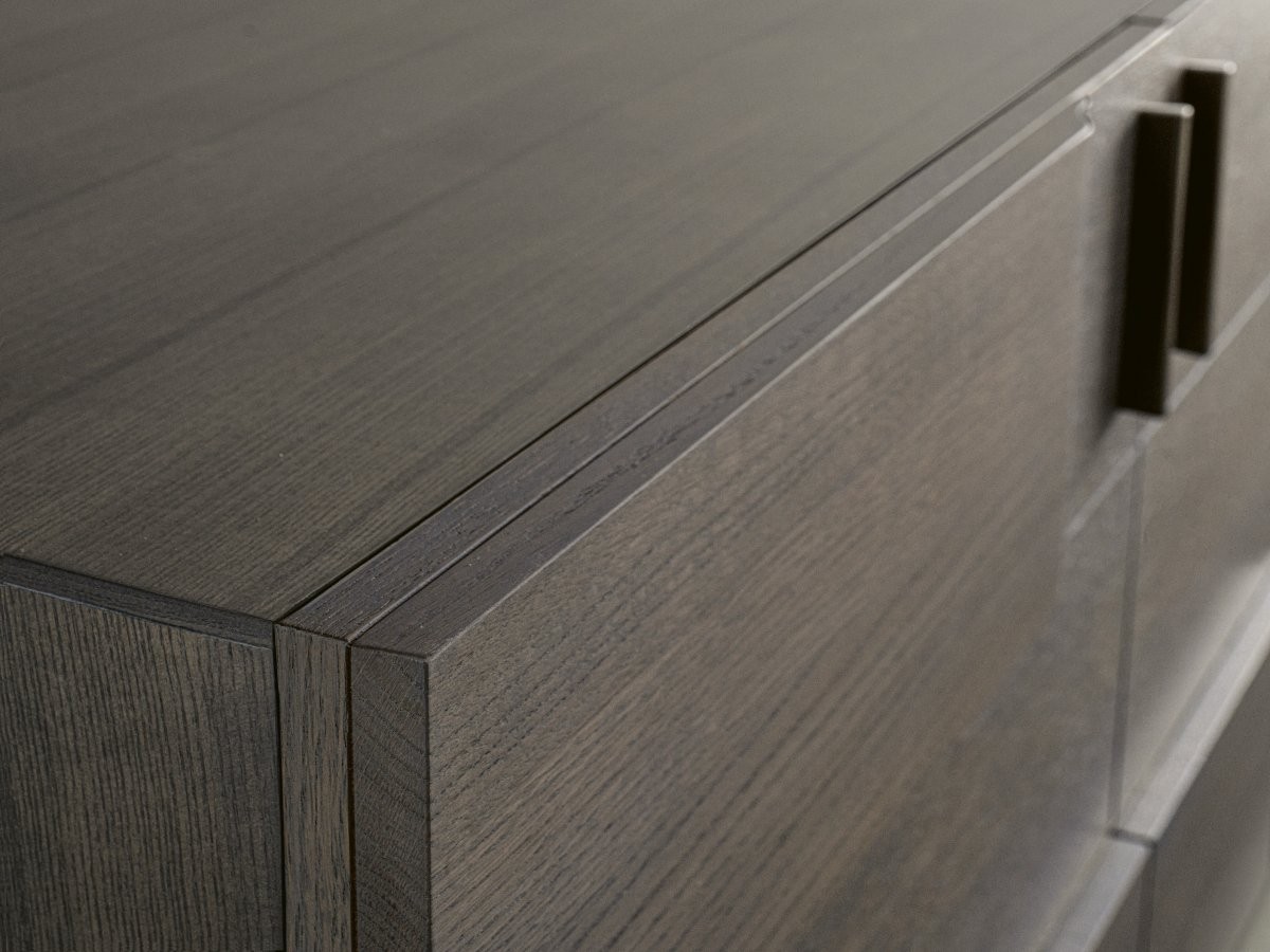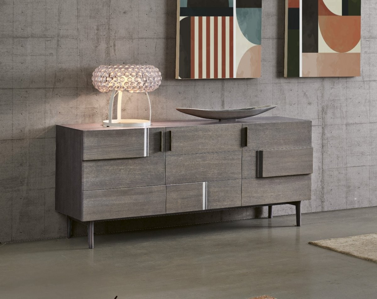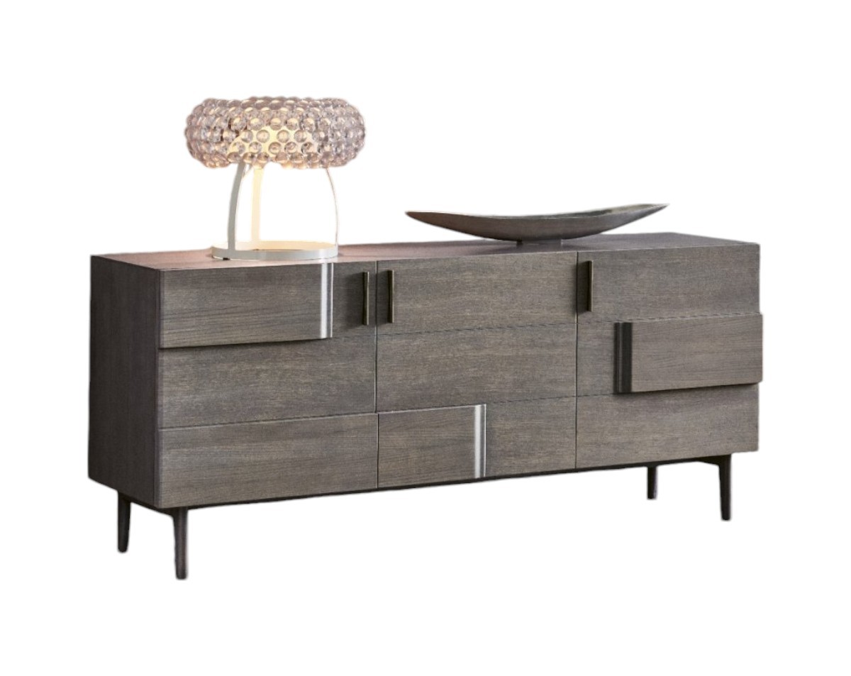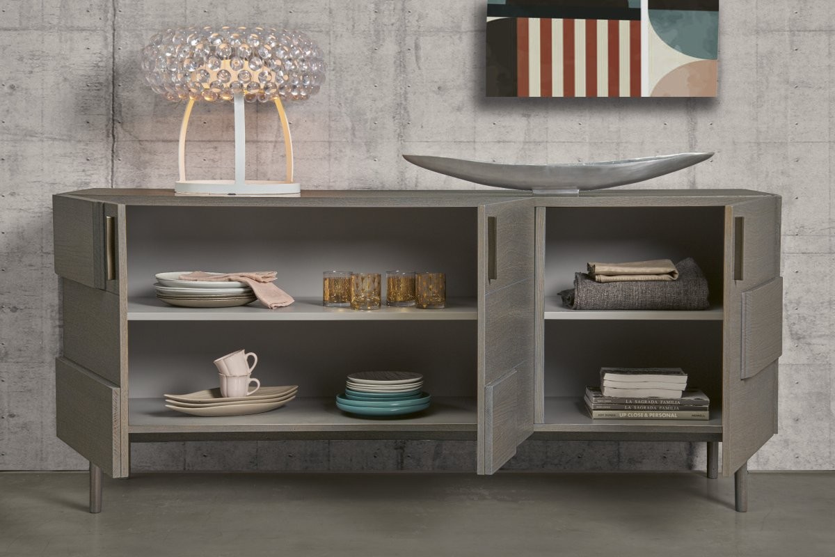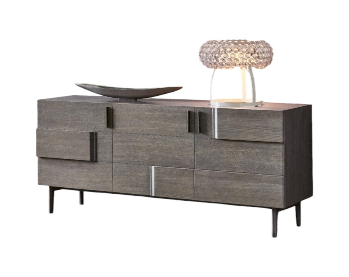 Credenza in stile contemporaneo adatta per inserire oggetti di varie dimensioni, funzionale e spaziosa che ti permetterà di risolvere i problemi di spazio grazie alle sue 3 porte con la chiusura rallentata. Elemento di arredo che conferisce un tocco di raffinatezza e calore grazie alla sua eleganza intramontabile che solo il rovere può offrire. L'elemento centrale di questa collezione è sicuramente il pannello sagomato applicato sui cassetti per creare un gioco armonioso tra i vari componenti.