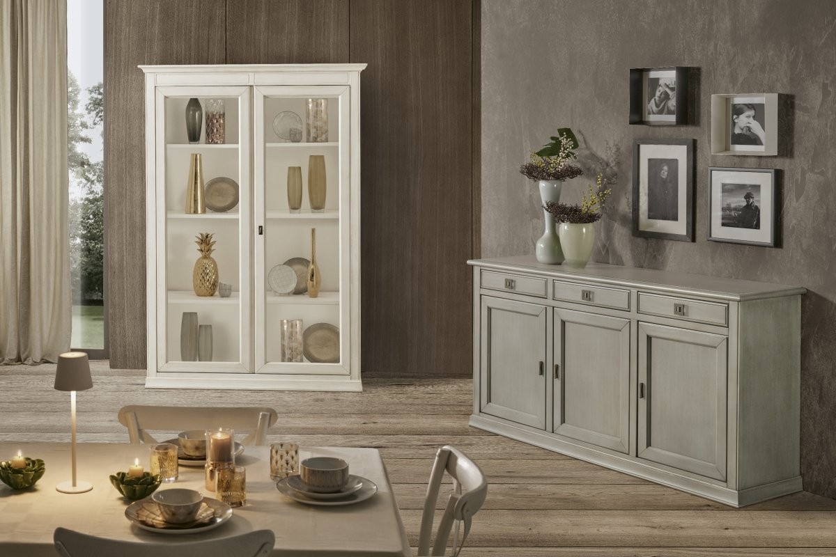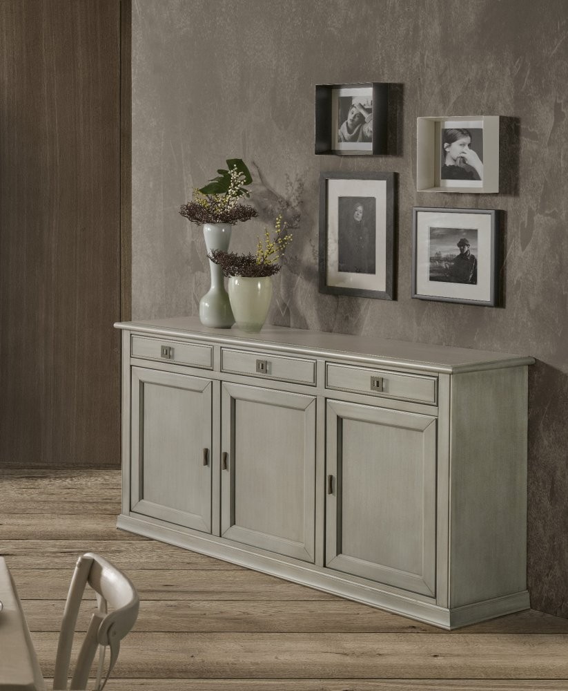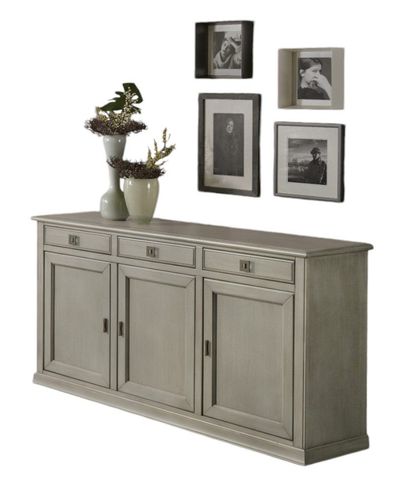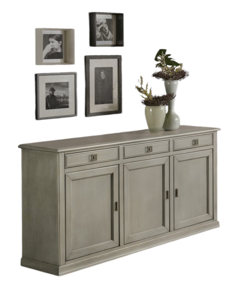 Credenza in legno che ti permetterà di risolvere i problemi di spazio grazie al suo ripiano interno ti permette di suddividere piatti, bicchieri e tazzine, sfruttando anche i tre cassetti per riporre tovaglie e accessori per la casa. Elemento di arredo che conferisce un tocco di raffinatezza e leggerezza grazie al suo stile classico capace di adattarsi a diversi stili di arredamento. L'elemento centrale di questa collezione è sicuramente la sua tonalità chiara che conferisce ad ogni ambiente un'atmosfera luminosa e raffinata.