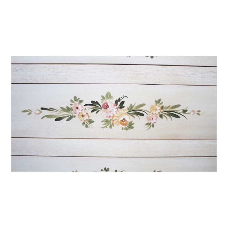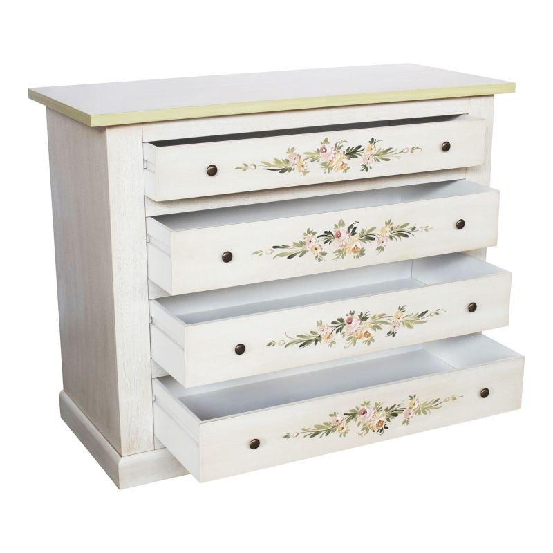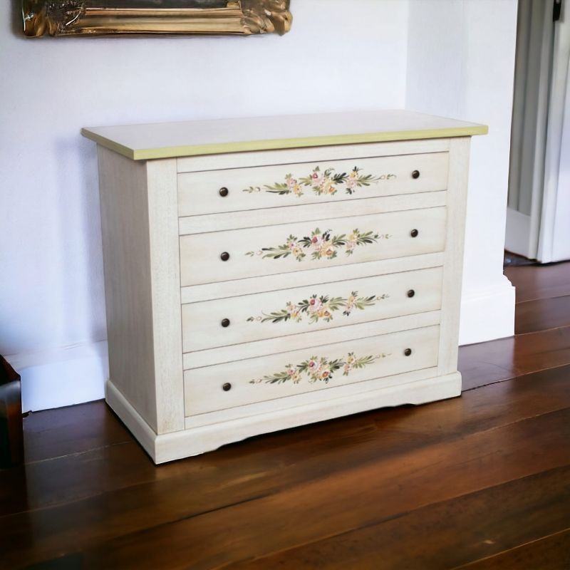 Cassettiera costruita in legno con zoccolo sagomato. Cassettiera dotata di cinque cassetti per riporre all'occorrenza biancheria intima e oggetti. Trovano facilmente posto nella zona notte proteggendo con i suoi cassetti il suo contenuto all'interno. Unica nel suo genere con la sua particolare laccatura bianco anticato con decori floreali dando un tocco a un' atmosfera dallo stile romantico.