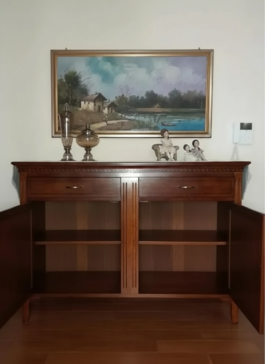 Credenza tradizionale classica 2 porte e 2 cassetti capiente e pratica. Complemento d'arredo adatto per una soluzione dotata di due cassetti e due porte utile per contenere oggetti , stoviglie, strofinacci e tovaglie a portata di mano all' occorrenza. La scelta perfetta per un' atmosfera romantica e unica, per riportare il fascino dal sapore retrò.