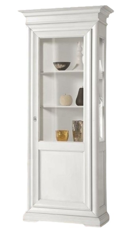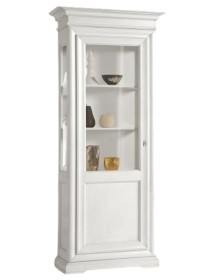 Elegante vetrina con un'anta battente con chiusura con chiave, arricchita da particolari sagomature nel legno e con il piano che riprende negli angoli la bombatura dello zoccolo sagomato, all'interno si trovano tre ripiani .