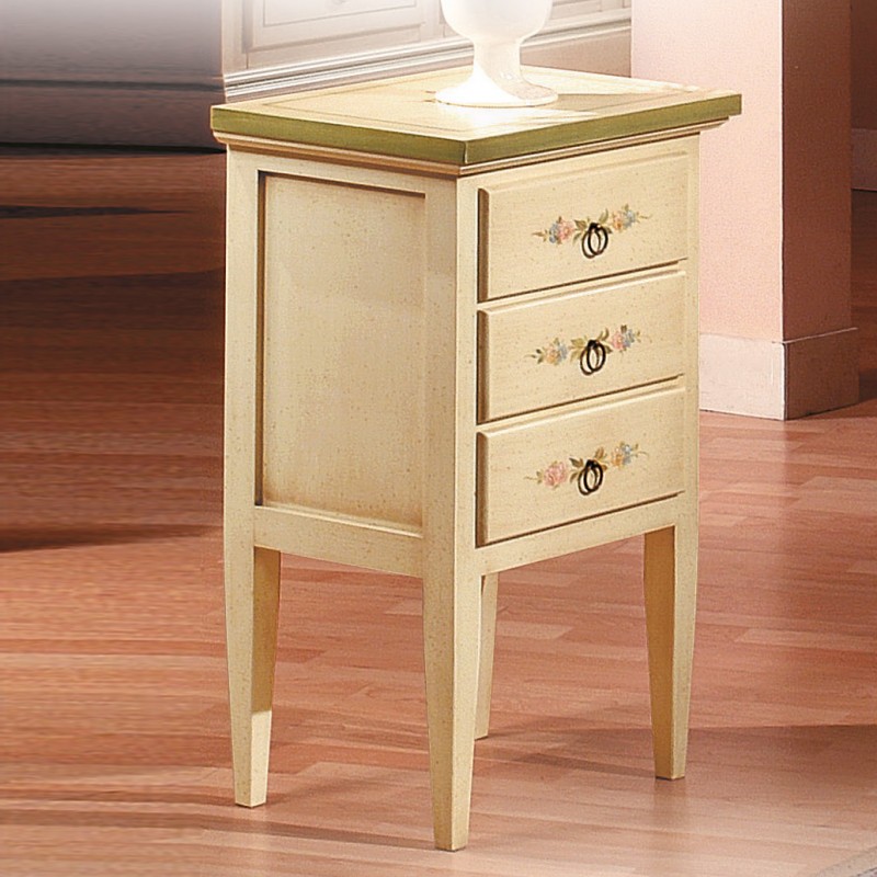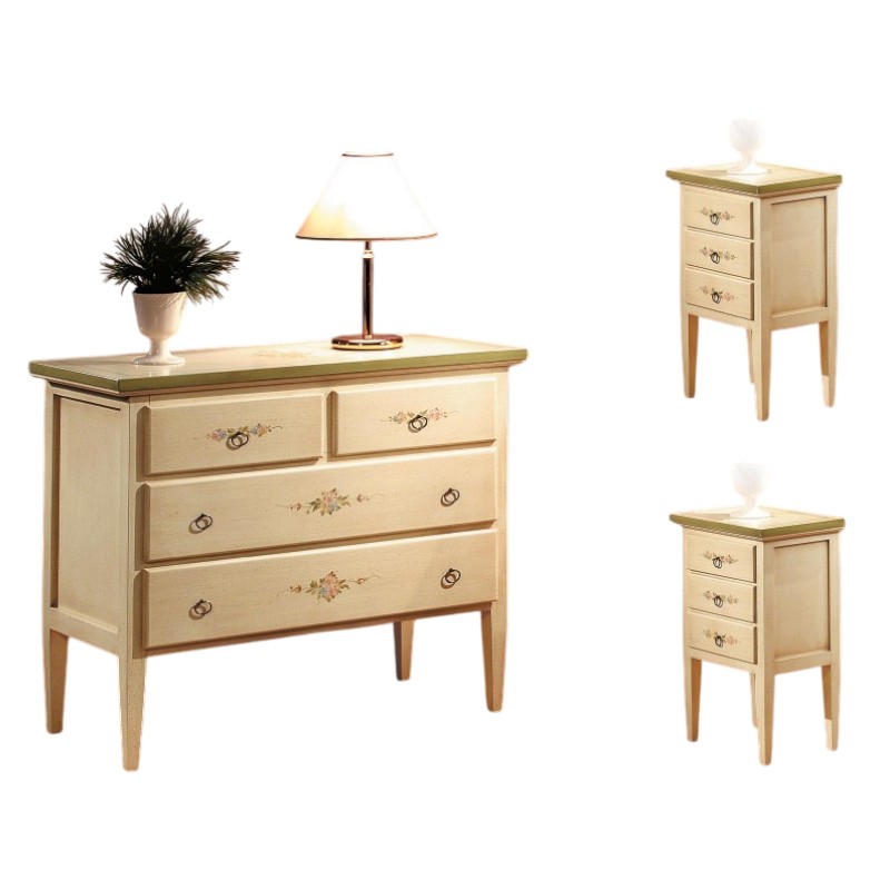 Gruppo cassettiera e Comodini costruiti in legno con angoli a becco di civetta e gambe sagomate. Cassettiera e comodini dotati di cassetti per riporre all'occorrenza biancheria intima e oggetti. Trovano facilmente posto nella zona notte proteggendo con i suoi cassetti il suo contenuto all'interno. Unici nel loro genere con i decori e la sua verniciatura shabby dando un tocco a un' atmosfera dallo stile d'altri tempi.