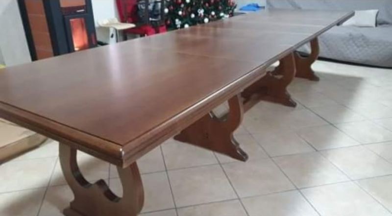 Tavolo costruito in legno massello di pioppo rendendo il mobile solido e robusto. Piano rettangolare con gambe sdoppiabili, dotato di 4 allunghe da 45 cm con apertura centrale. Le allunghe sono riposte sotto il piano pronte all' occorrenza per ospitare numerose persone. Ideale per la zona giorno o per la zona della taverna ospitando amici per il pranzo o per la cena.