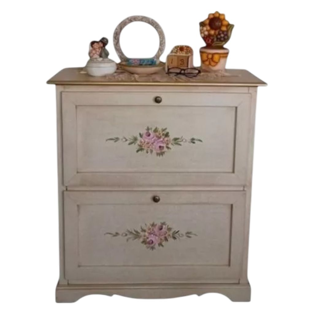 Scarpiera 2 ante ribalta legno shabby avorio anticato filo oro 79X30X90