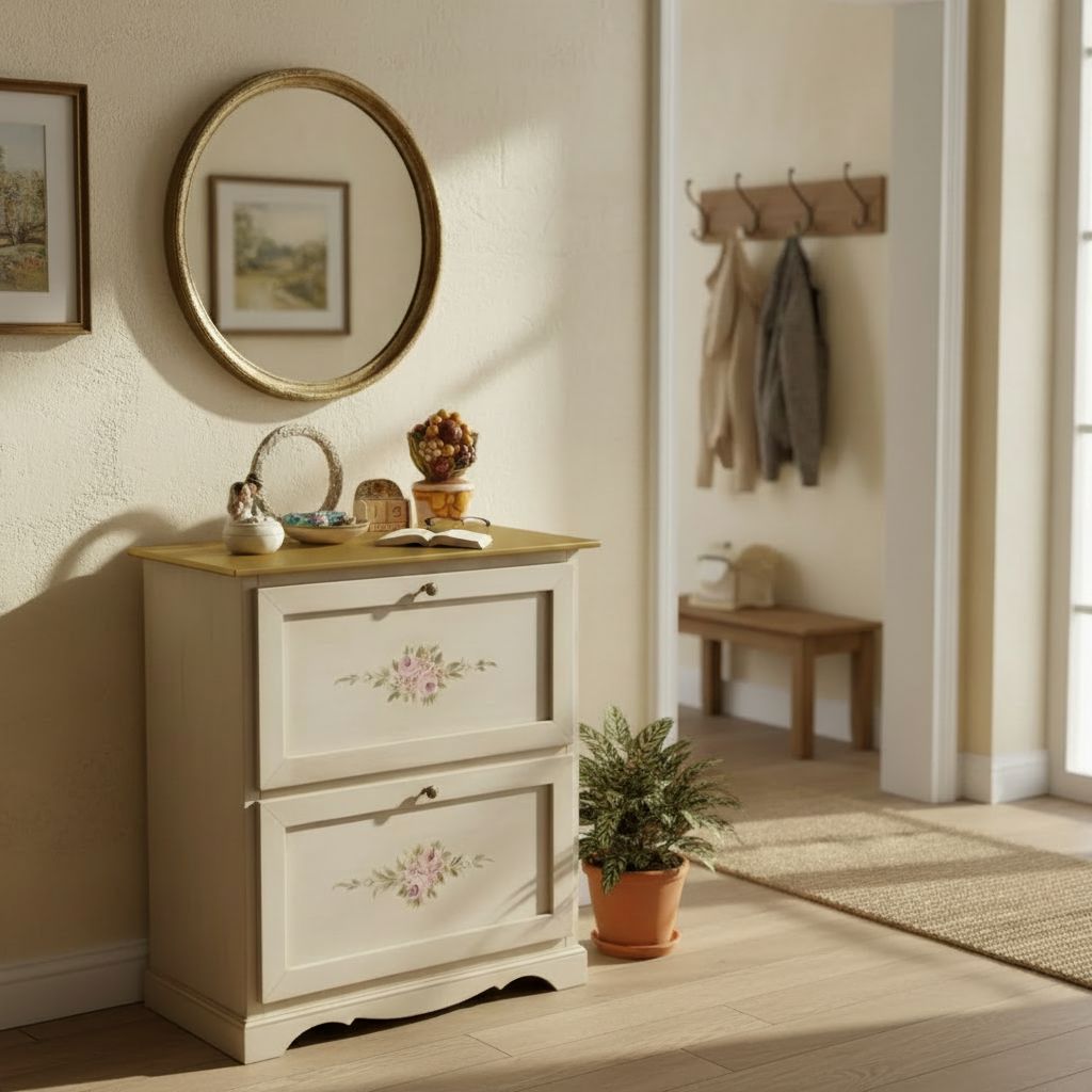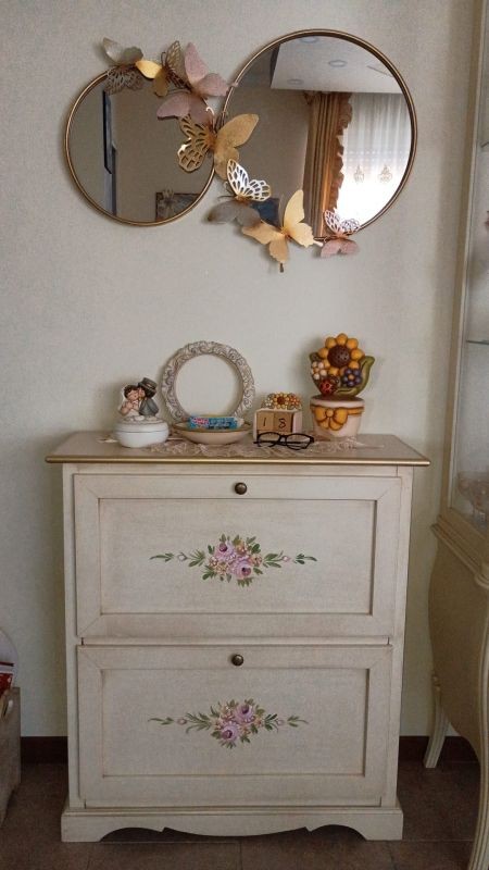Meravigliosa scarpiera bassa in stile shabby chic, perfetta per chi desidera mantenere l’ingresso o la zona giorno sempre in ordine, valorizzando gli ambienti con il fascino e l’eleganza dell’arredo classico.