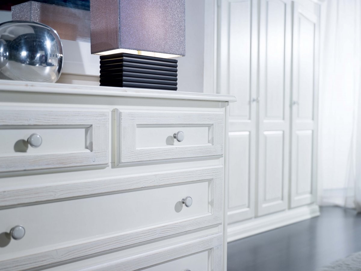 Finitura: particolare laccato bianco leggermente trasparente per non coprire le venature e nodi del legno di abete