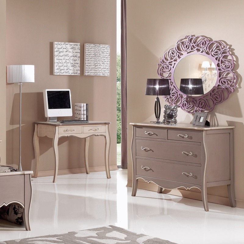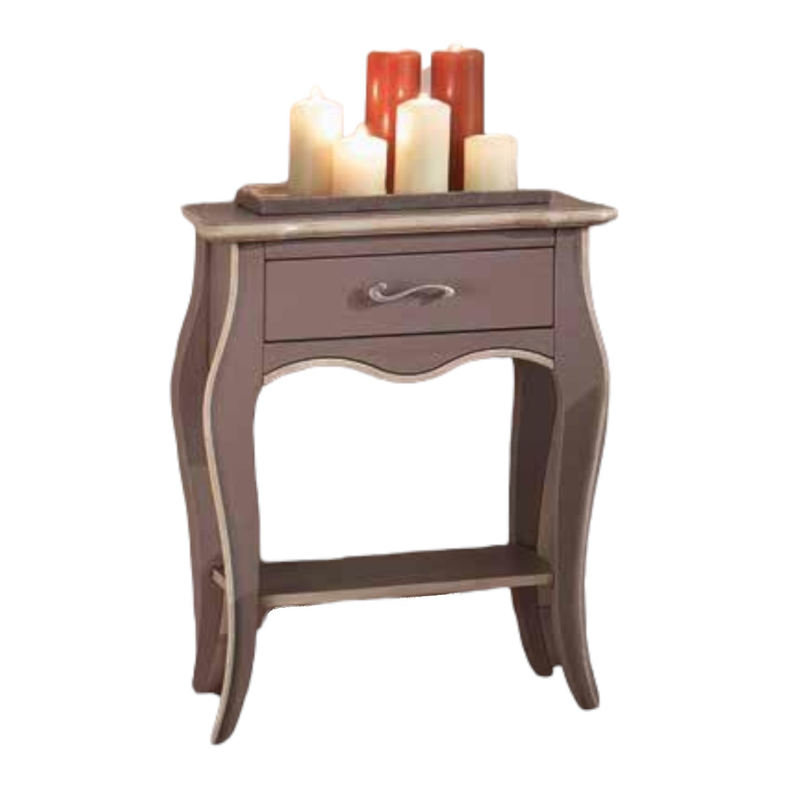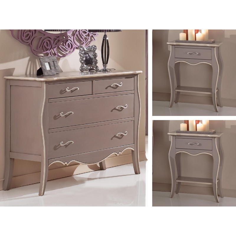 Realizzato in Italia in legno massello di pioppo, questo set si distingue per la particolare finitura tortora anticato con filetti avorio patinato, eseguita artigianalmente per garantire un arredo esclusivo e di classe.