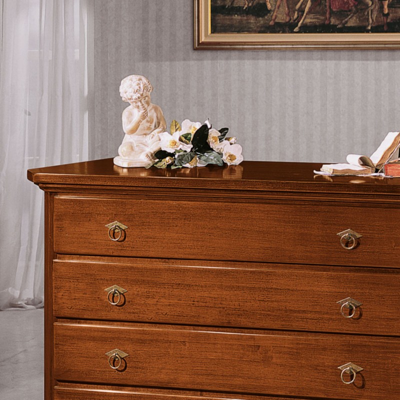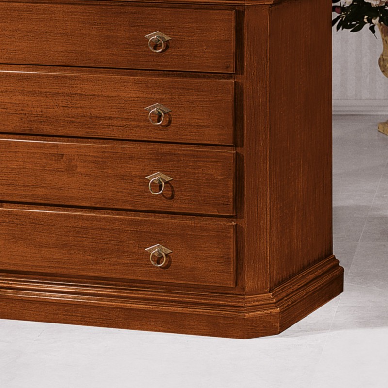 Cassettiera costruita in legno con angoli sagomati e zoccolo a terra. Cassettiera dotata di cassetti per riporre all'occorrenza biancheria intima e oggetti. Trovano facilmente posto nella zona notte proteggendo con i suoi cassetti il suo contenuto all'interno. Unica nel suo genere con le sue linee classiche dando un tocco a un' atmosfera dallo stile d'altri tempi.