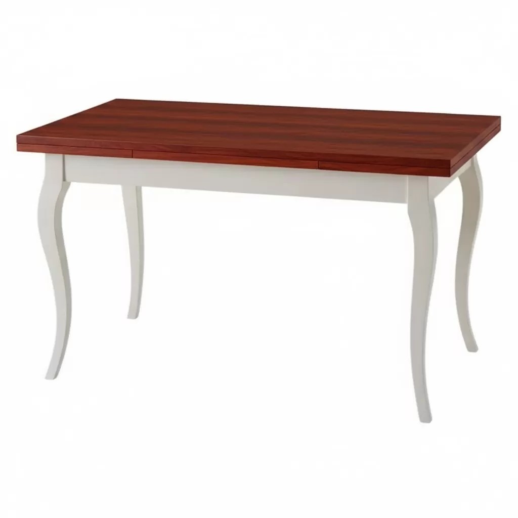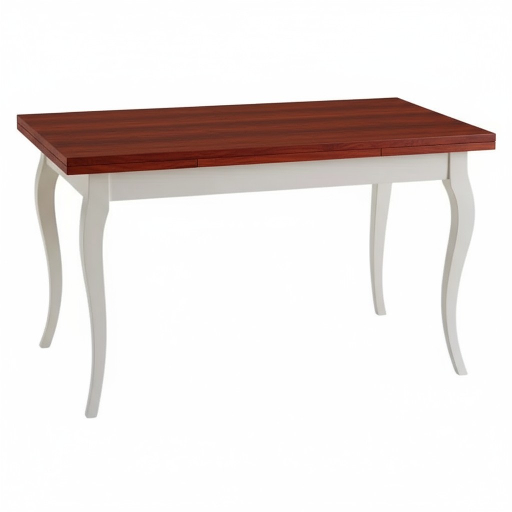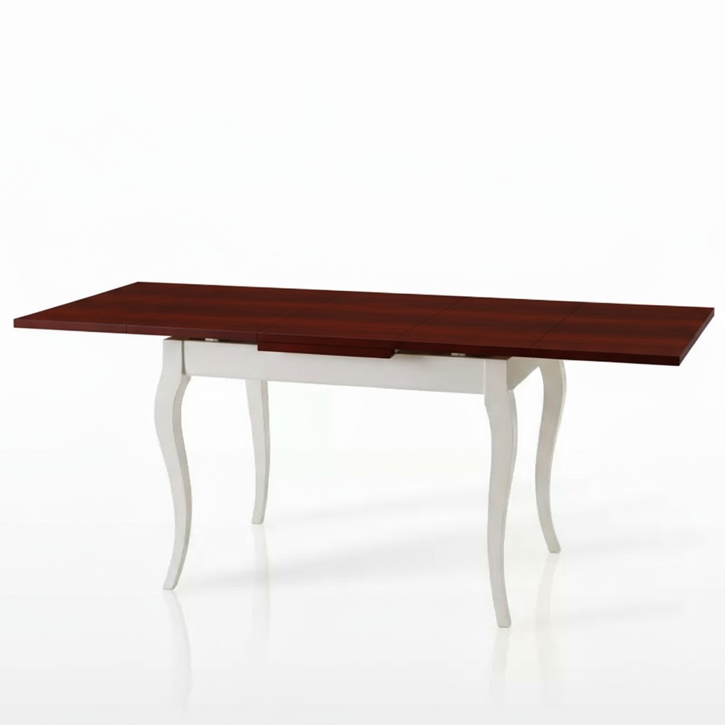 Tavolo costruito in legno massello di pioppo rendendo il mobile solido e allo stesso tempo elegante. Piano rettangolare con gambe a sciabola. Dotato di due allunghe da 40 cm allungabile con apertura laterale da entrambi i lati, detta anche "apertura a tiro", le allunghe sono riposte sotto il piano. Ideale per il soggiorno o in cucina.