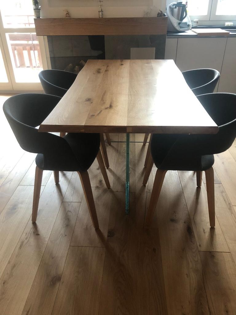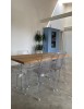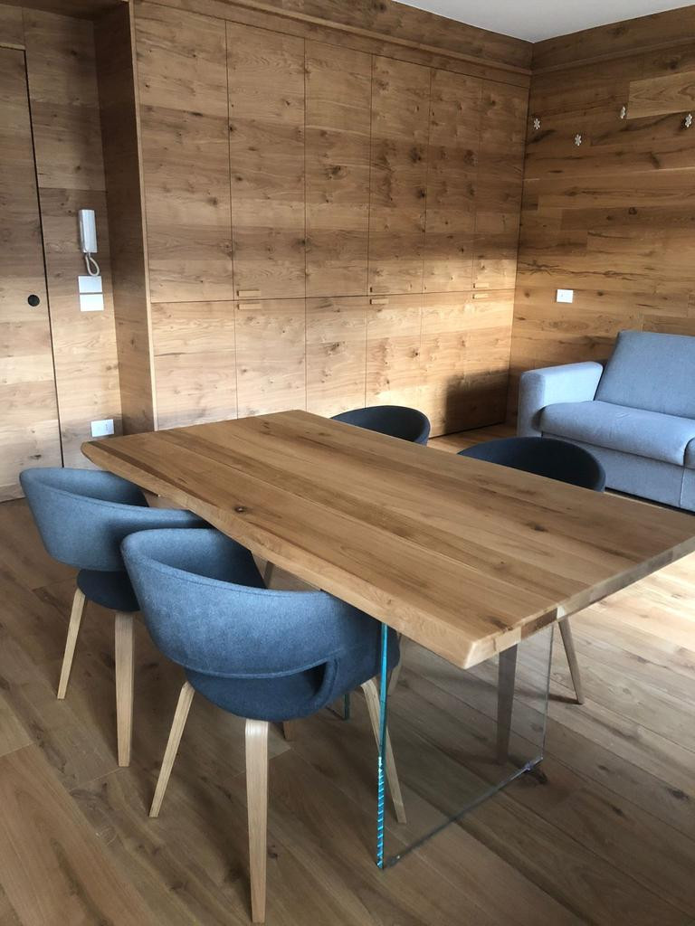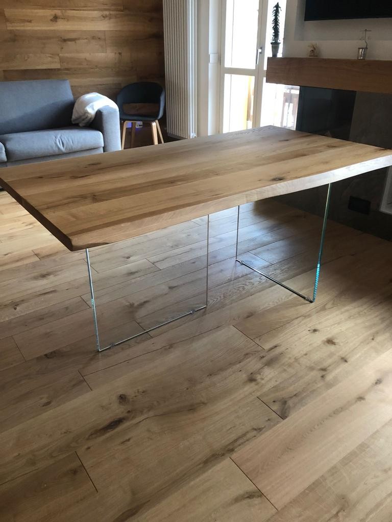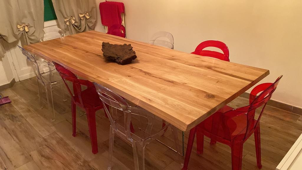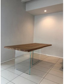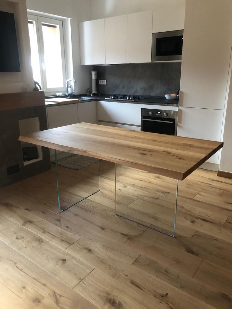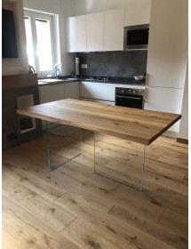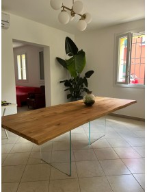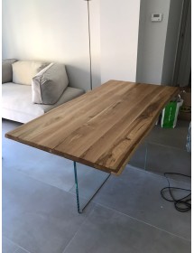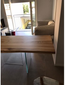 Tavolo Fisso in legno massello con spessore 4 cm e gambe in vetro.
