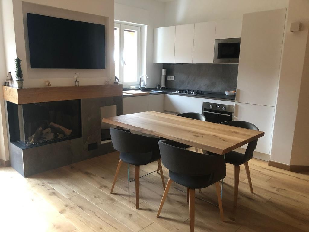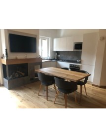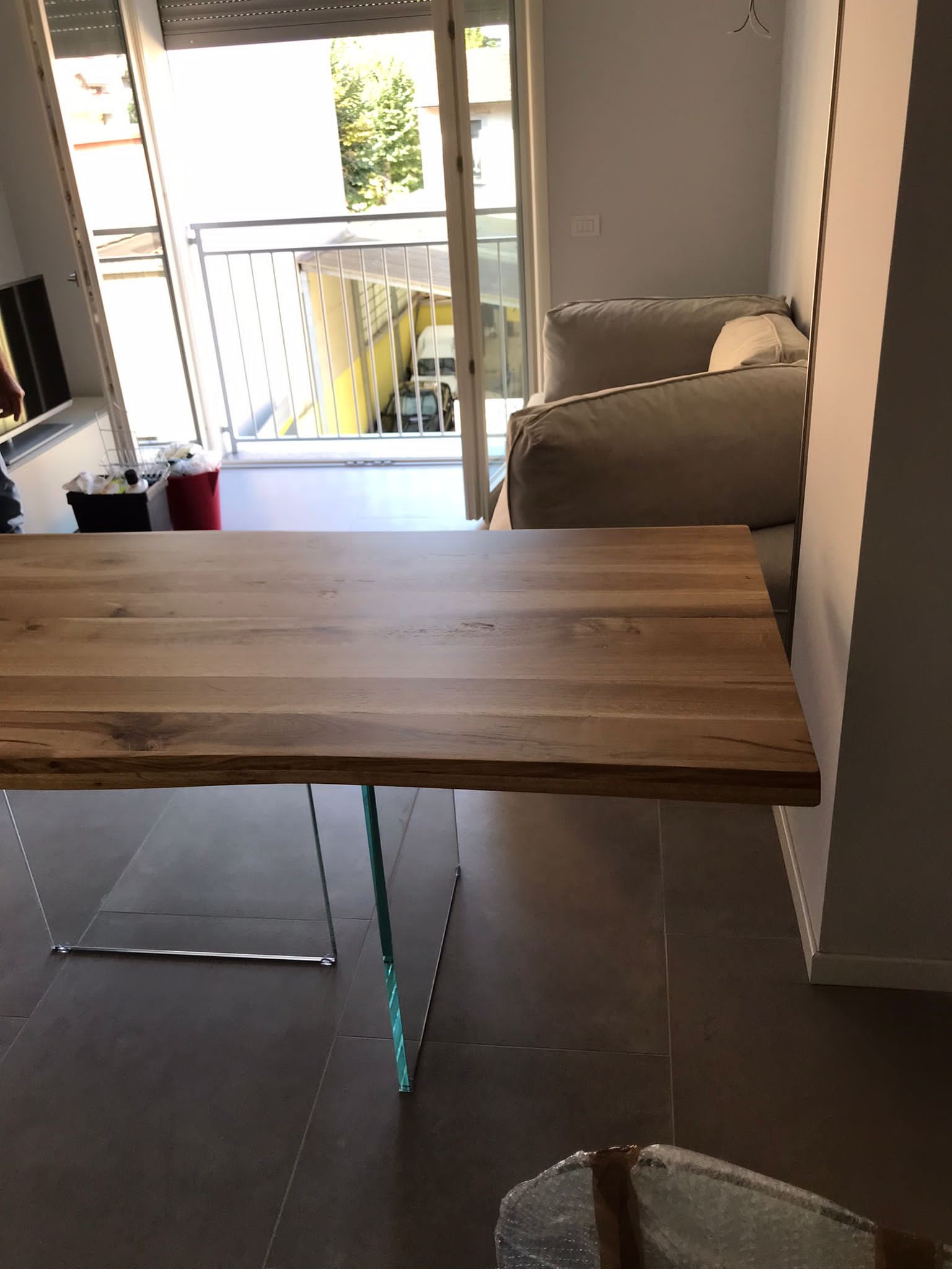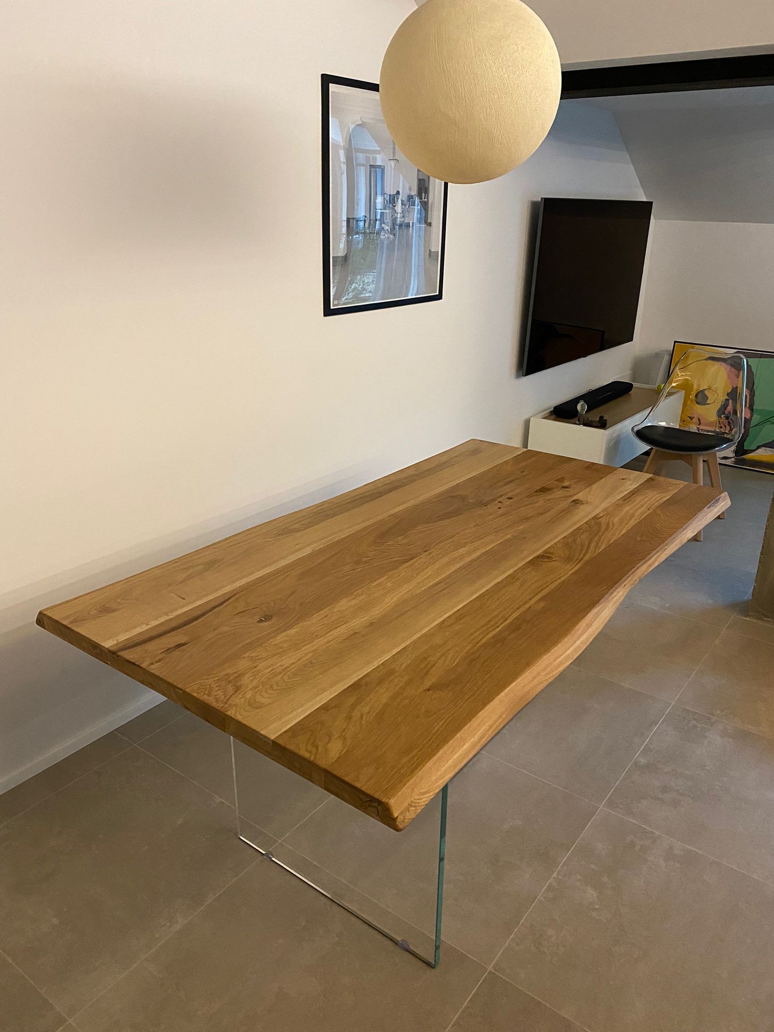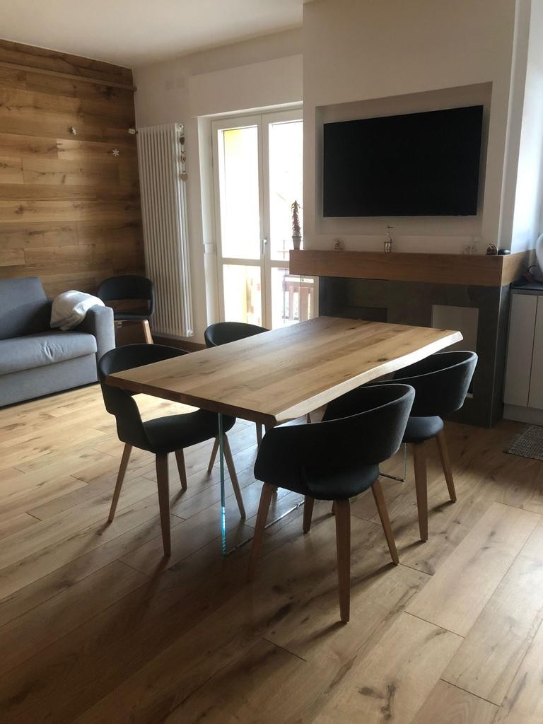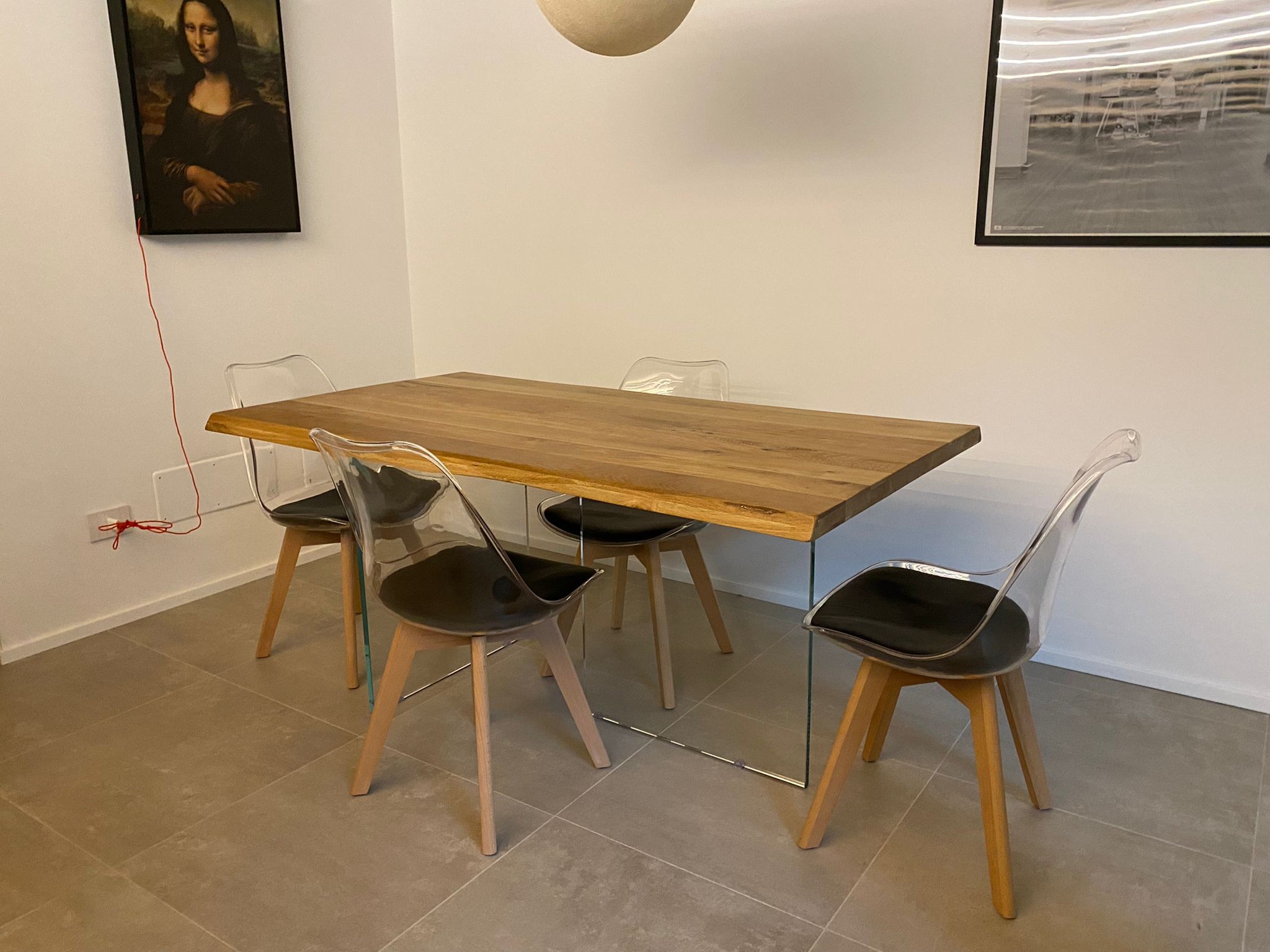 Tavolo Fisso in legno massello con spessore 4 cm e gambe in vetro.