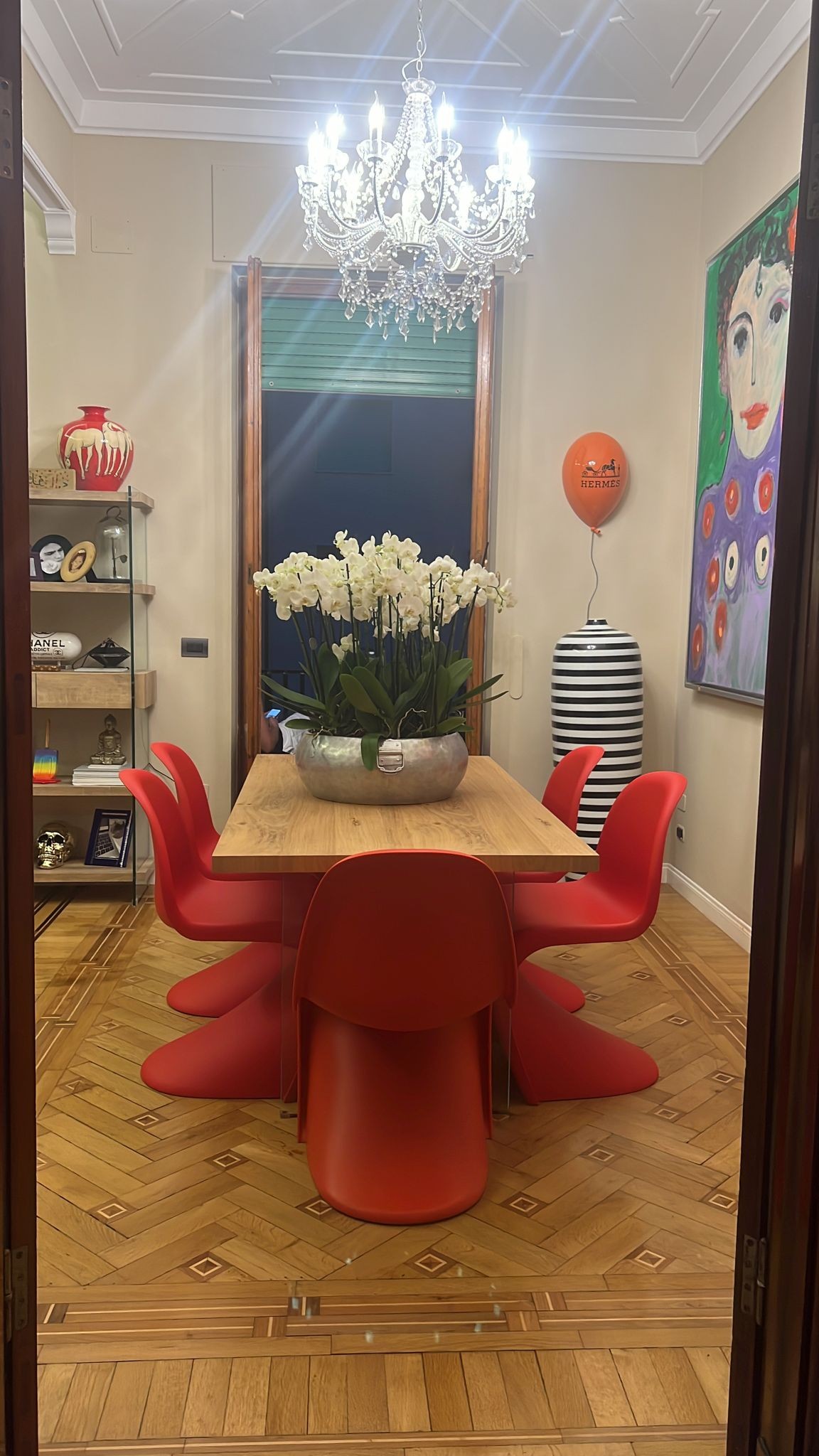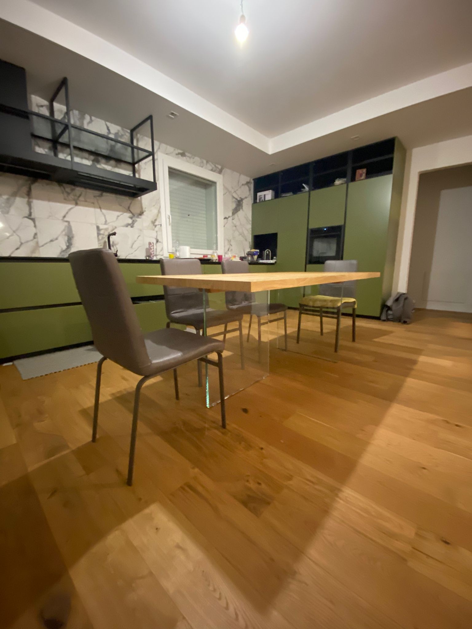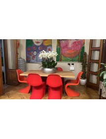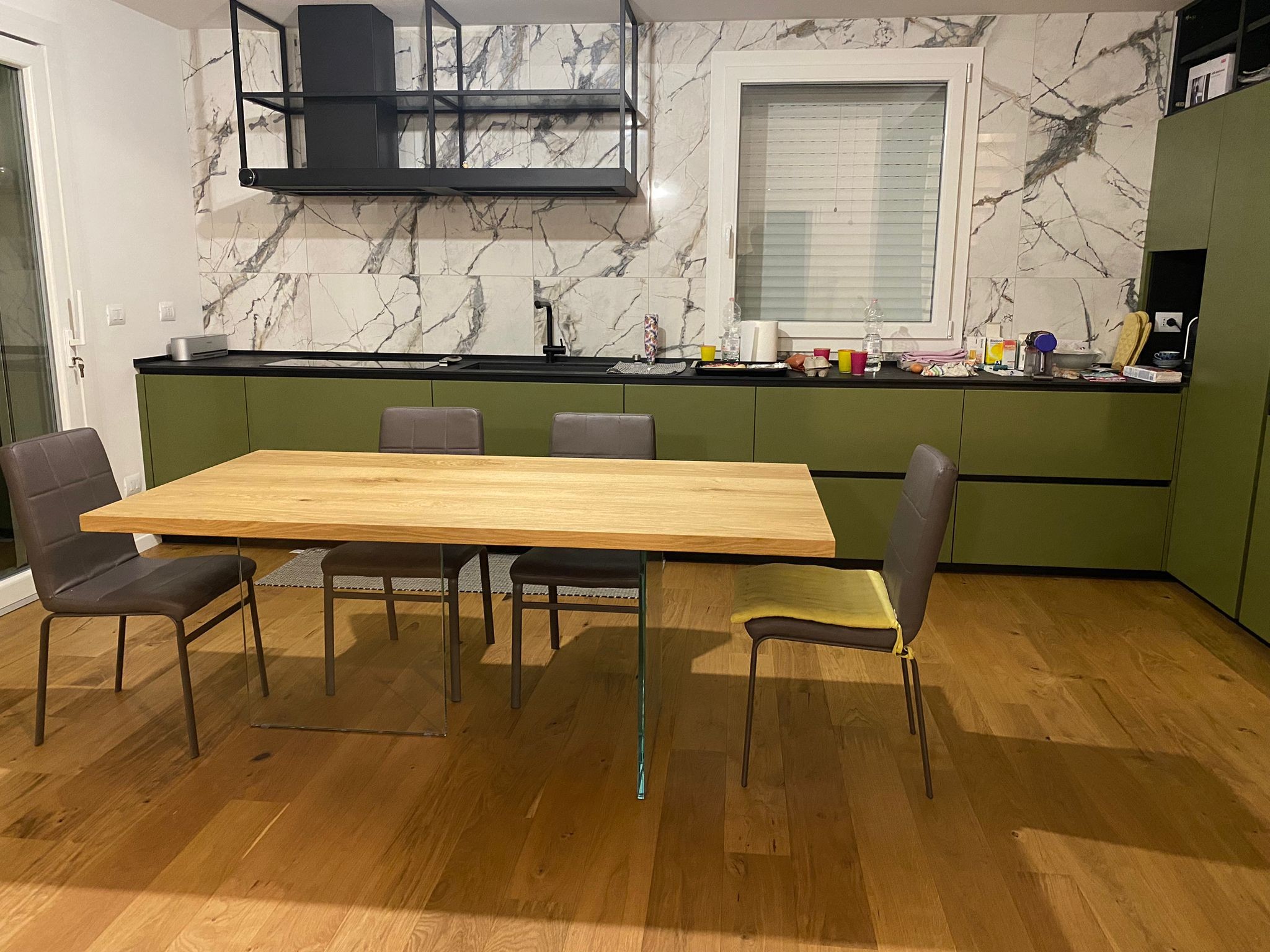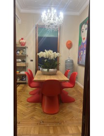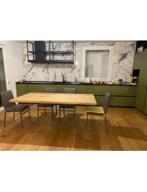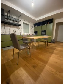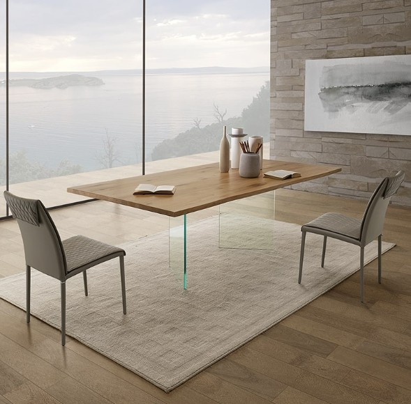 Tavolo Fisso in legno impiallacciato con spessore 4 cm e gambe in vetro.