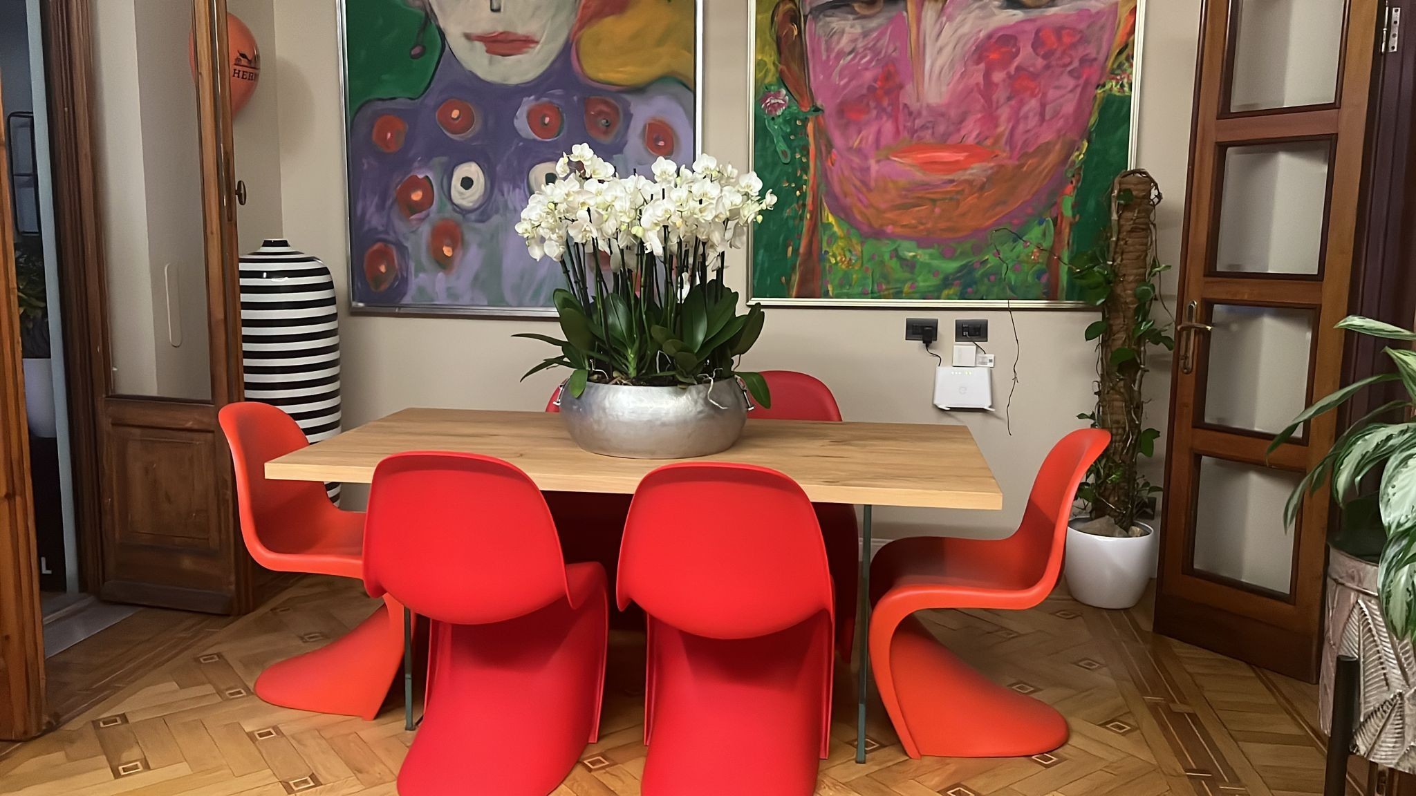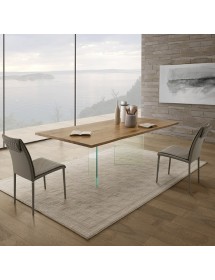 Tavolo Fisso in legno impiallacciato con spessore 4 cm e gambe in vetro.