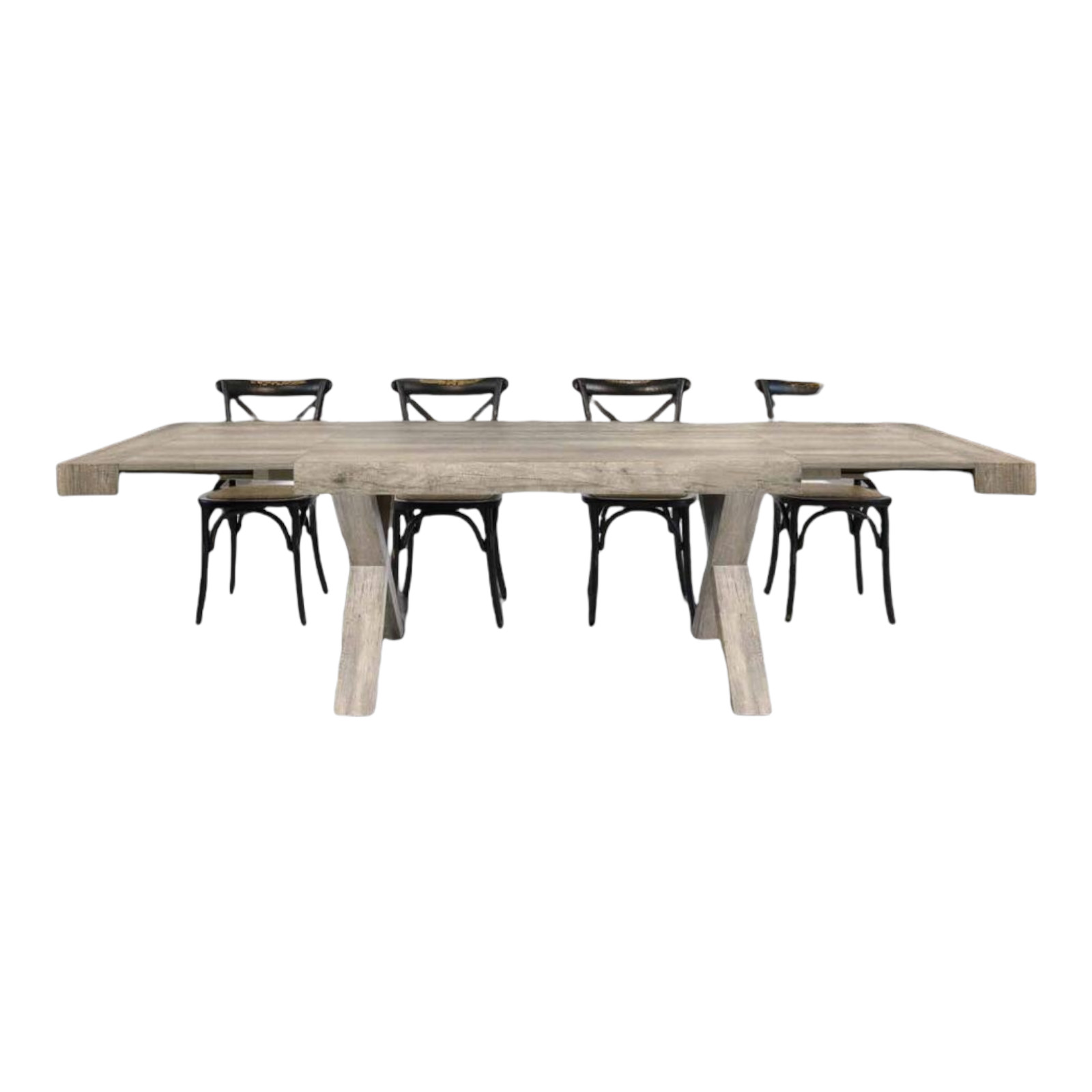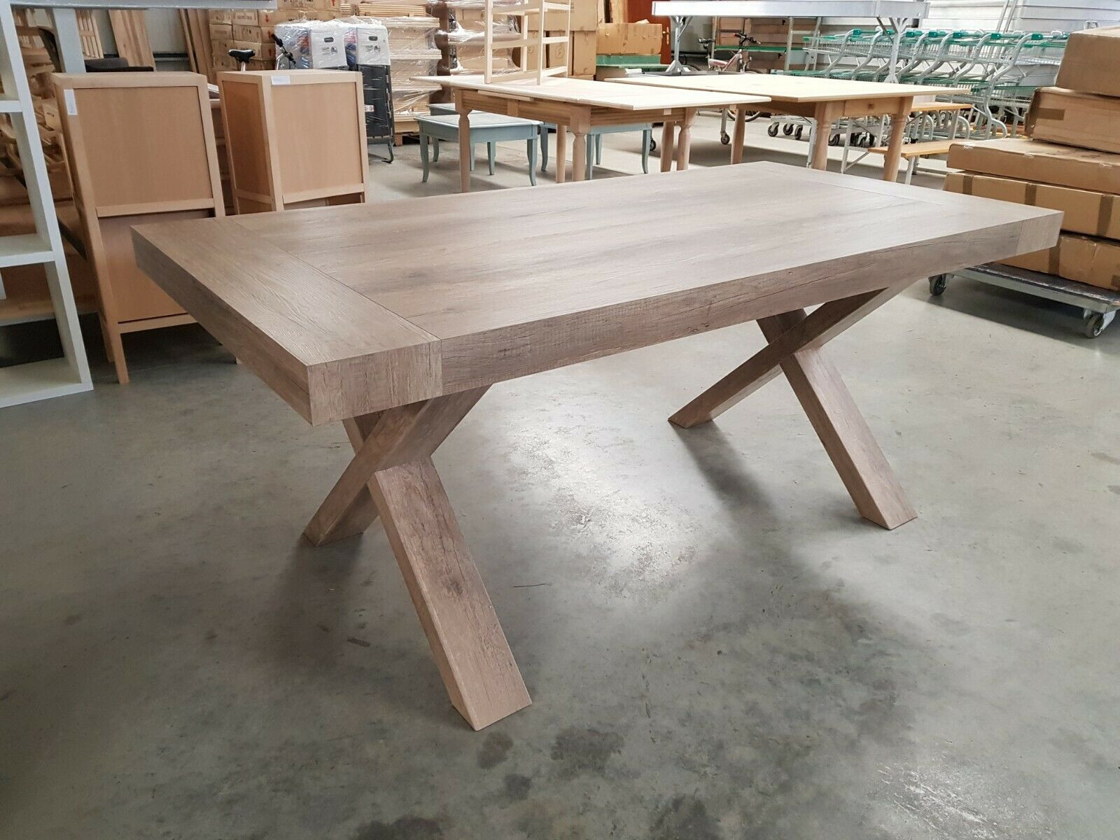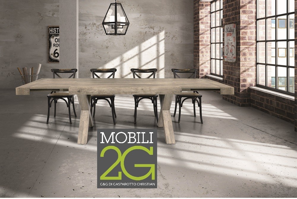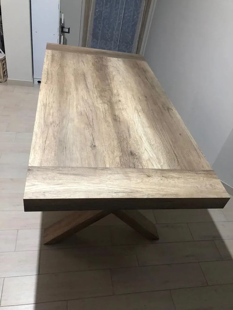 Tavolo con basamento a crocera di pieno impatto e carattere distintivo di questo prodotto.