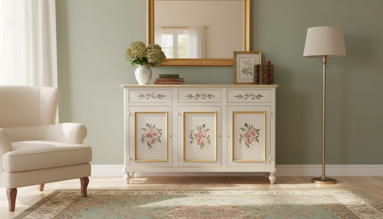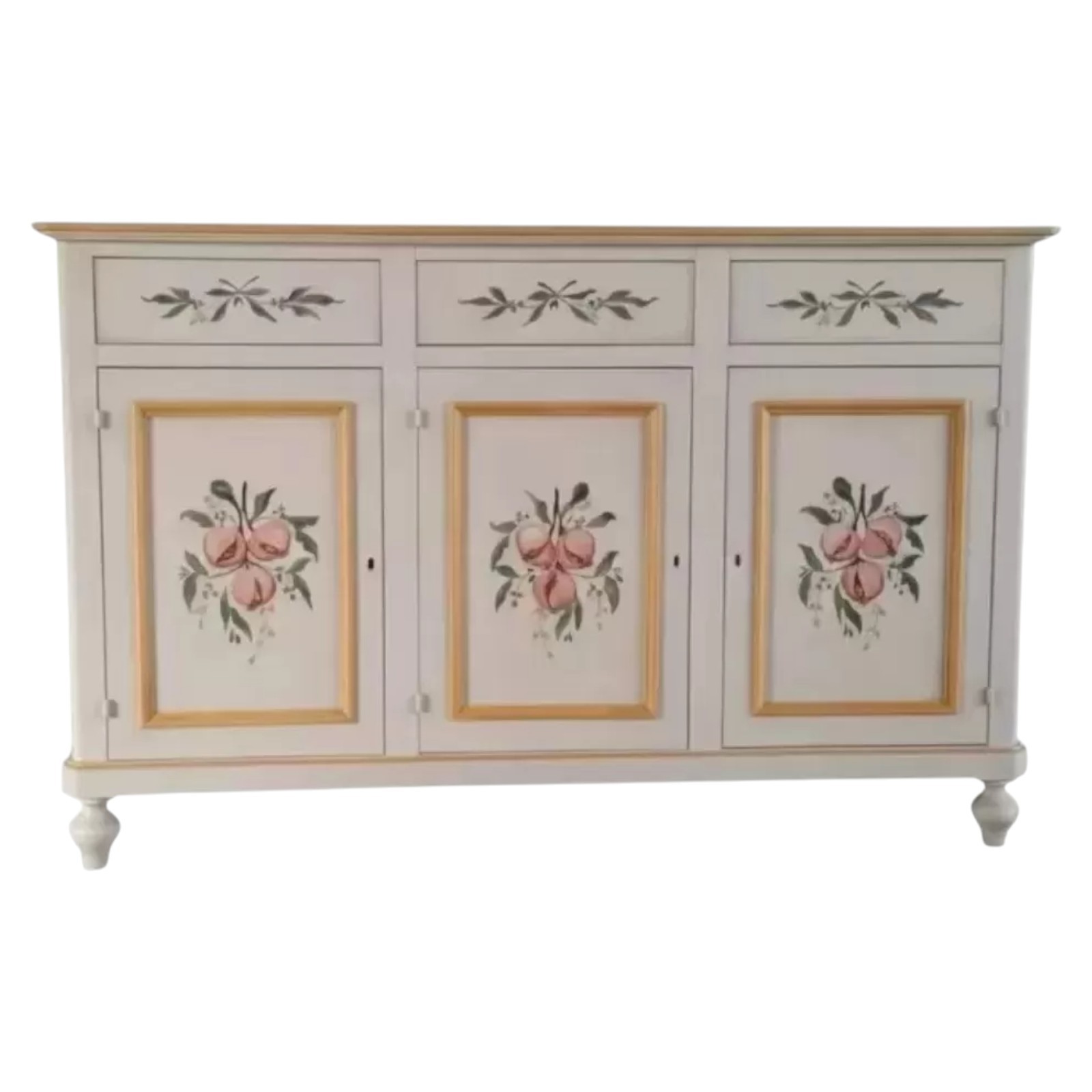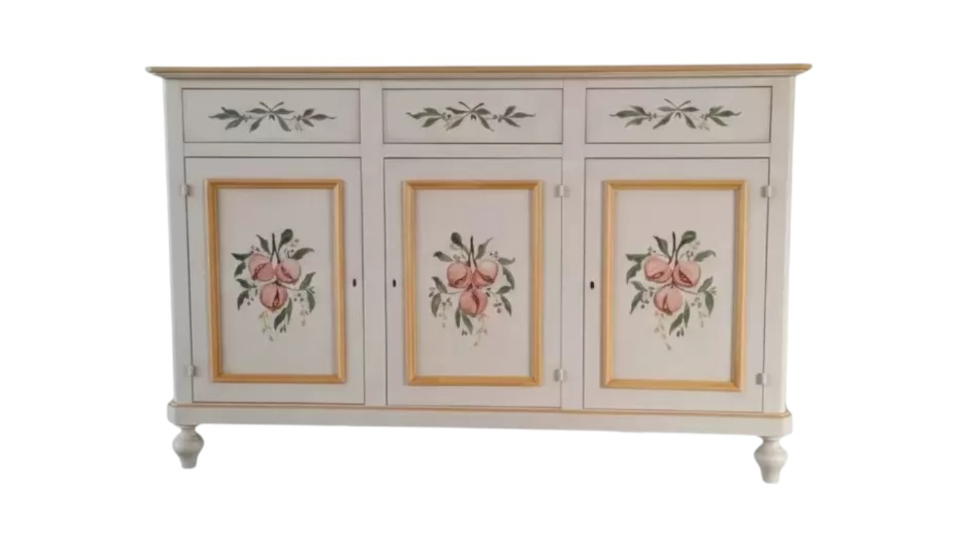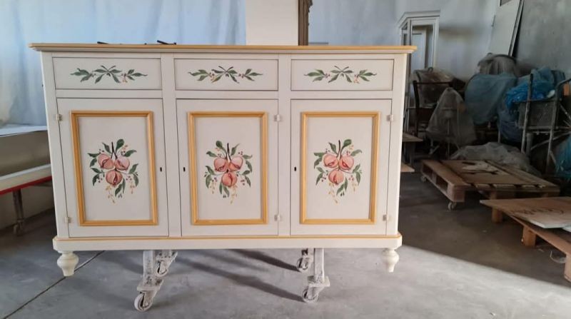 Credenza 3 Ante Legno Bianco anticato Decorata Filo ocra 160x50x102