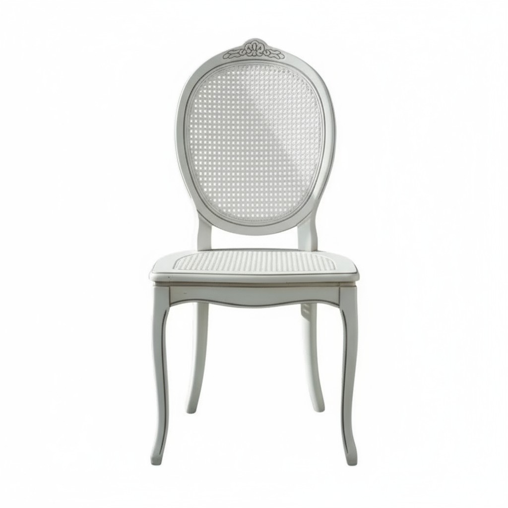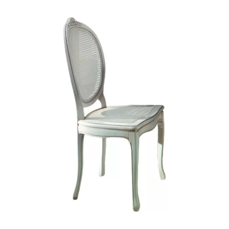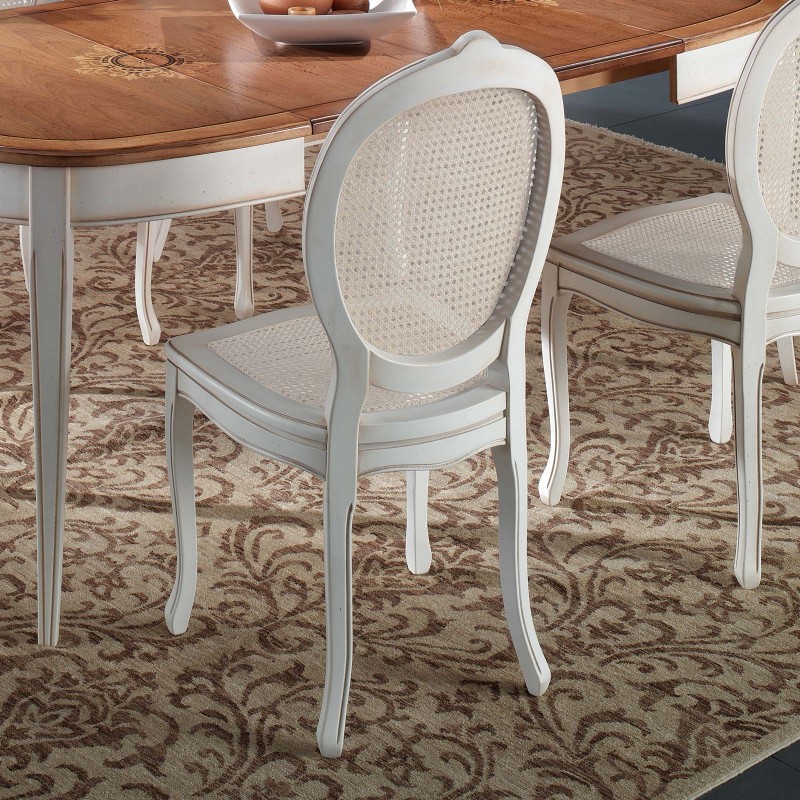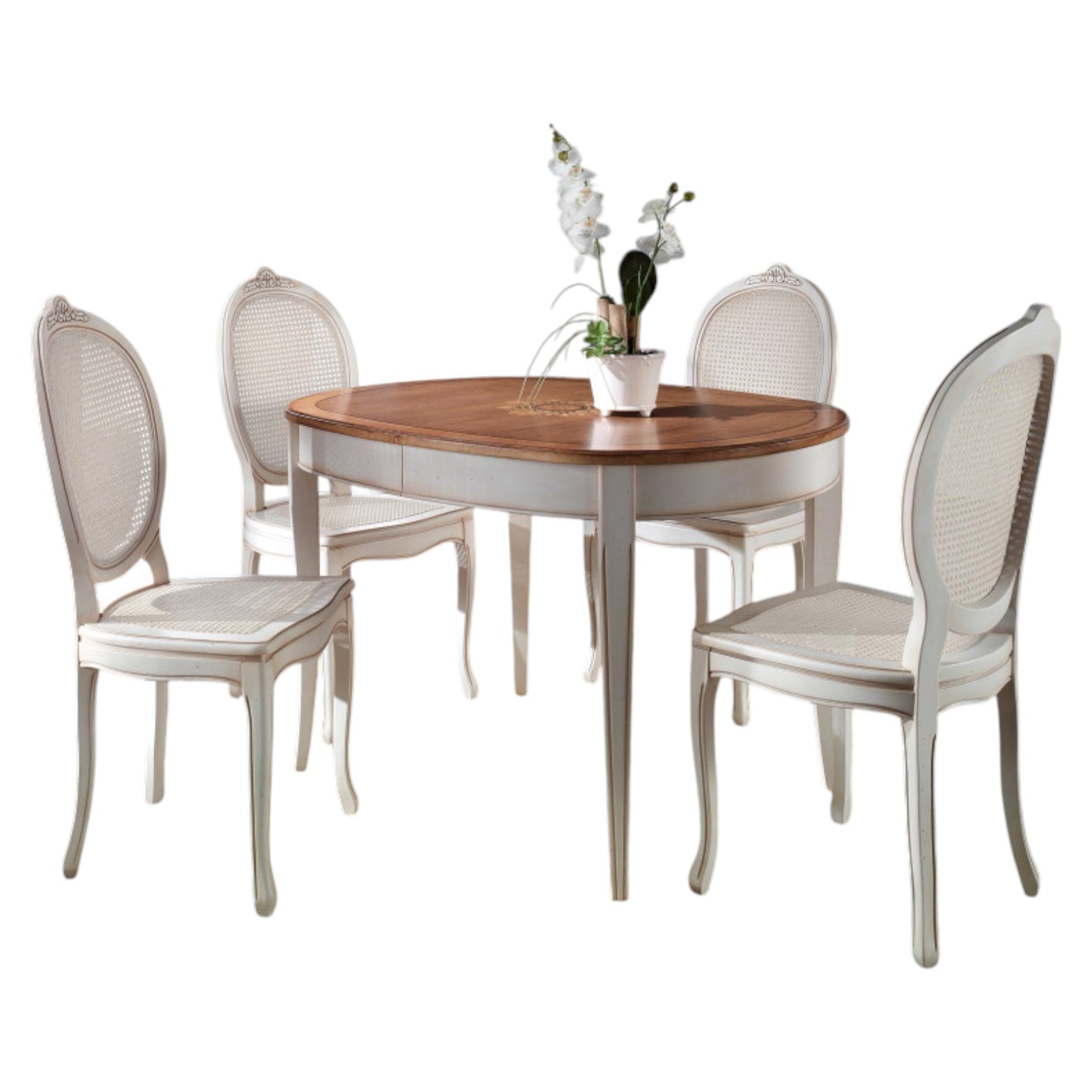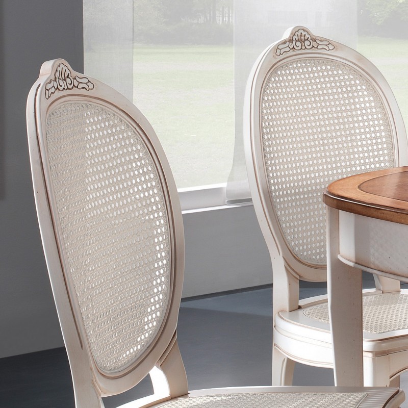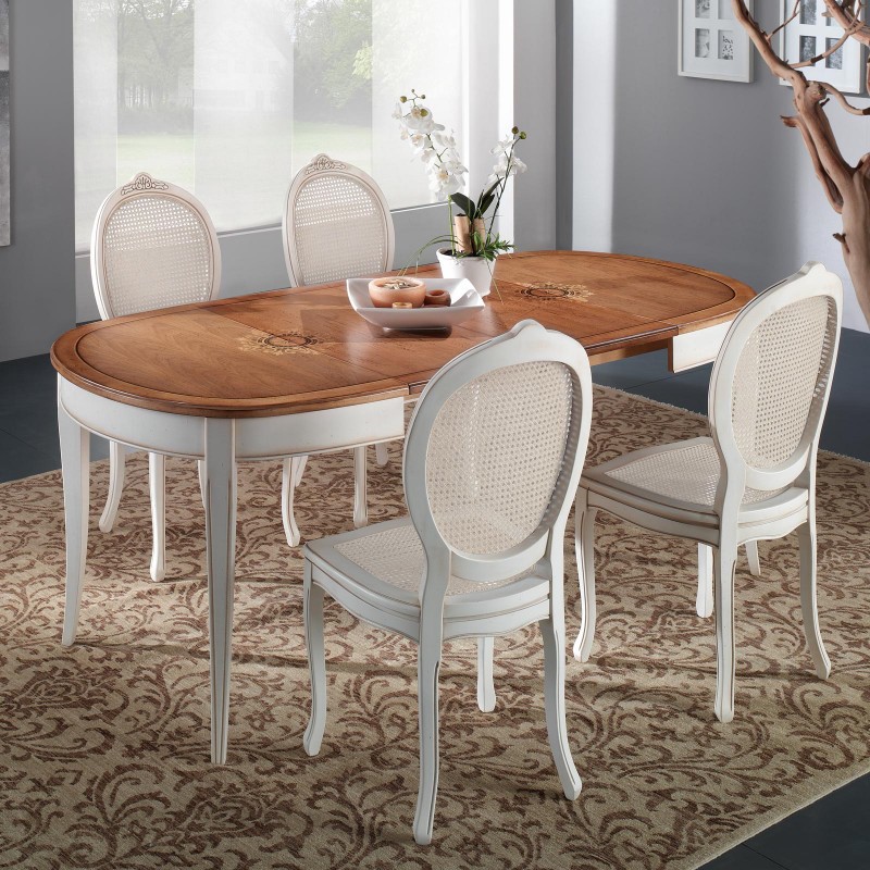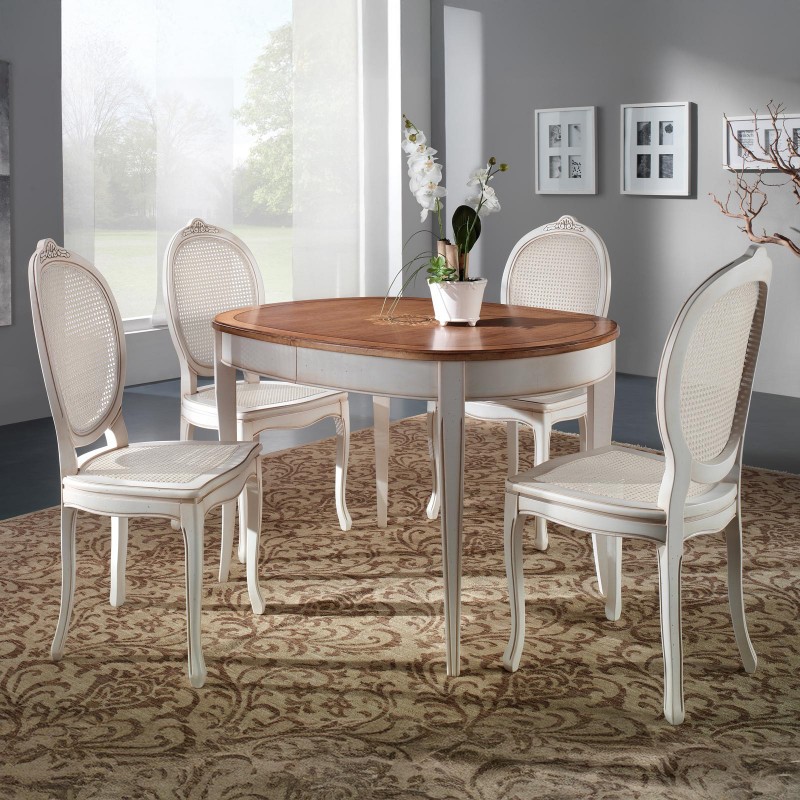 Set tavolo ovale Legno bianco anticato 115x95x78 con 4 sedie seduta paglia di vienna