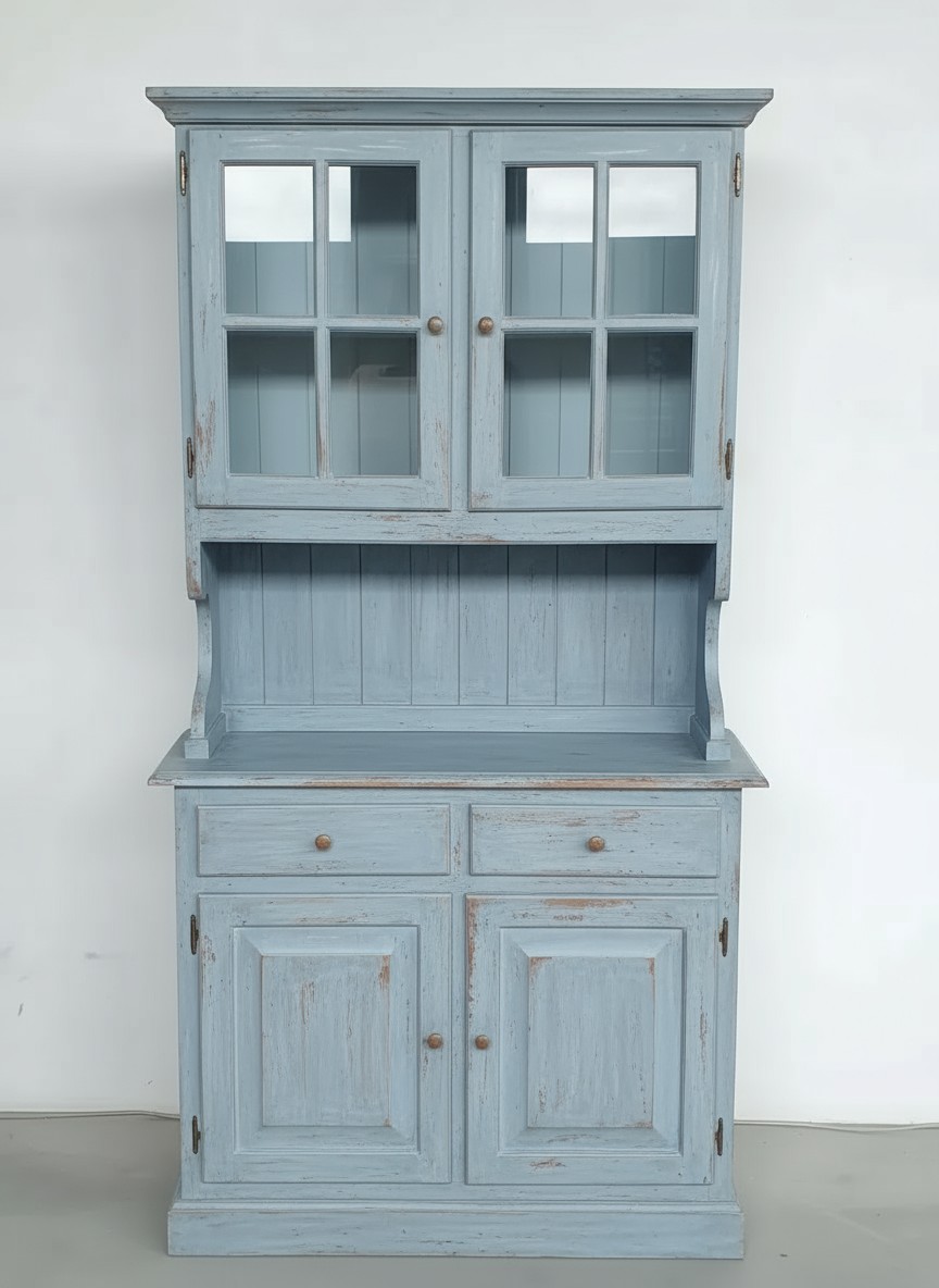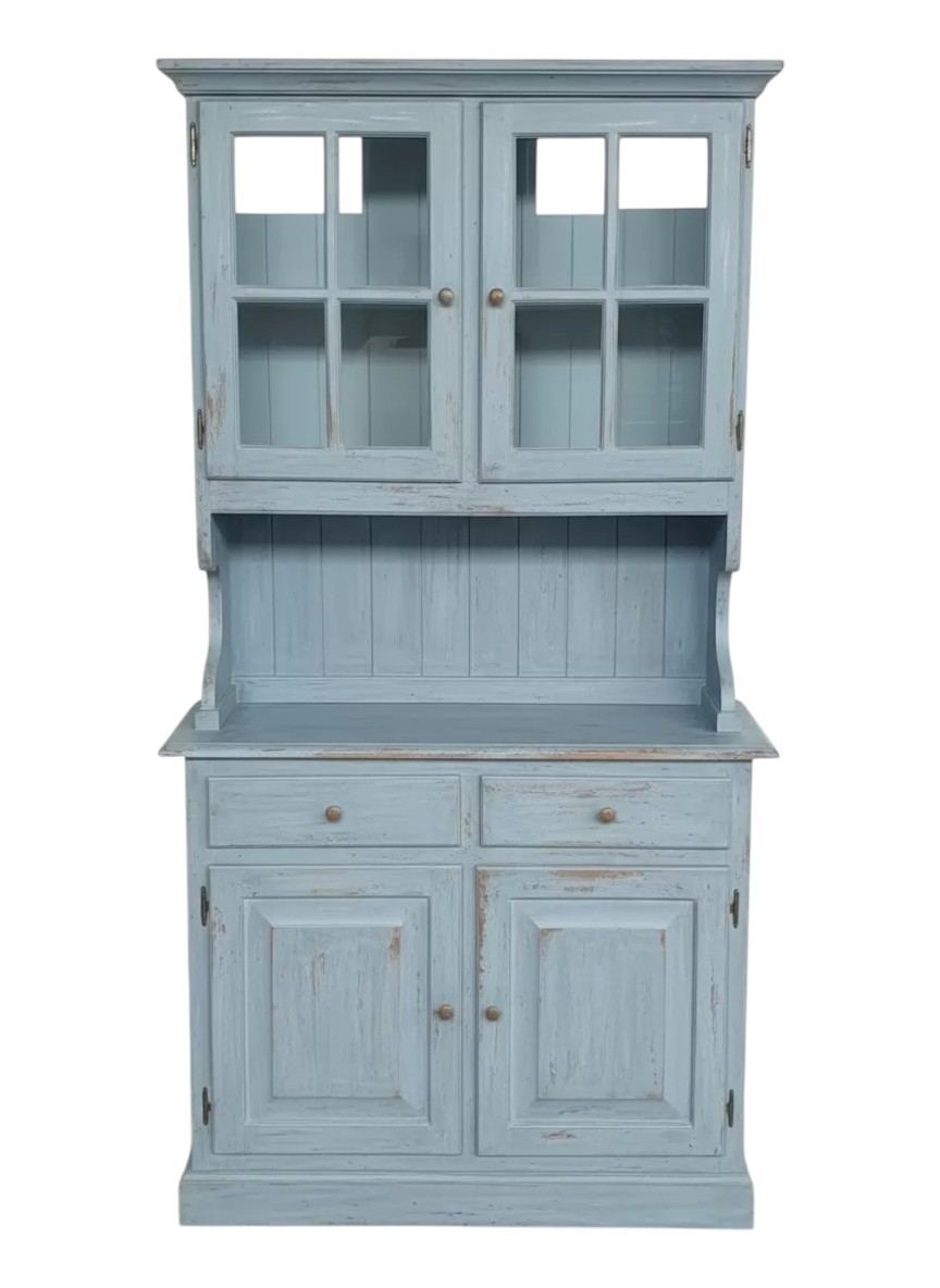 Cristalliera con 4 ante e 2 cassetti con vetrina superiore con 2 ante in vetro all' inglese e vano a giorno perlinato. Zoccolo a terra, in perfetto stile country, sono un classico che si adatta ad ogni ambiente.