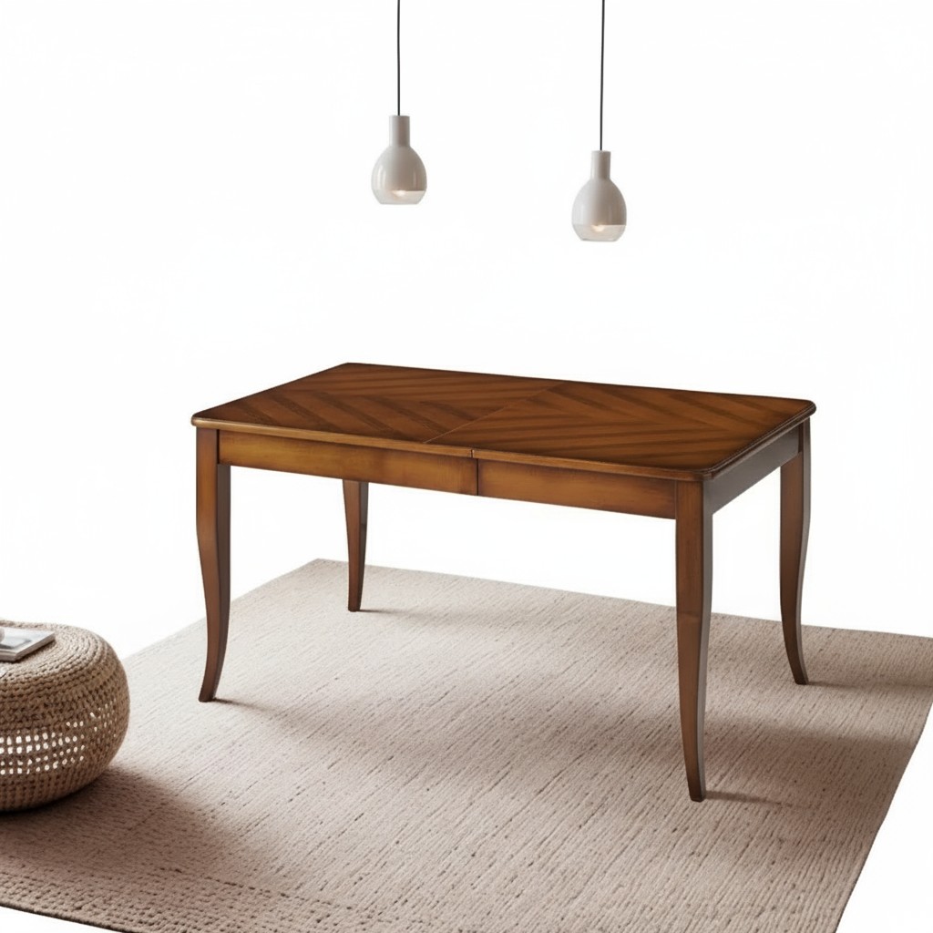 Tavolo rettangolare costruito in legno massello con gambe a sciabola sagomate e piano a spinapesce rendendo il mobile solido e allo stesso tempo elegante. Dotato di due allunghe da 45 cm allungabile con apertura centrale, detta anche 'apertura a scorrimento', le allunghe sono riposte sotto il piano. Ideale per il soggiorno e la cucina , un must intramontabile destinato a durare nel tempo e fuori dalle mode del presente.