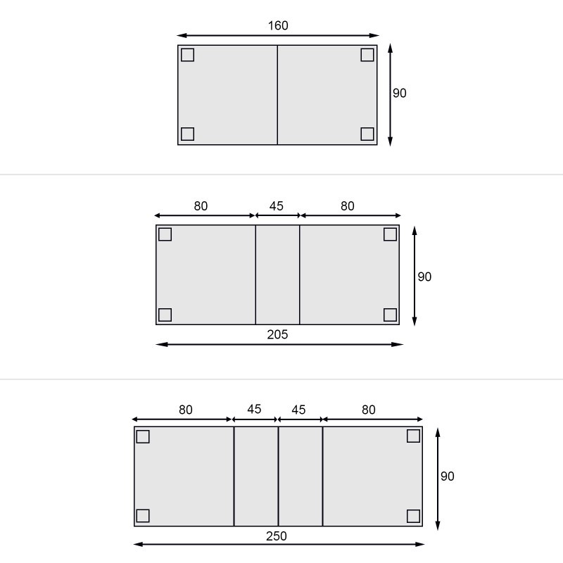 - Misura aperto con due allunghe cm 250 x 90: spazio per 10/12 persone