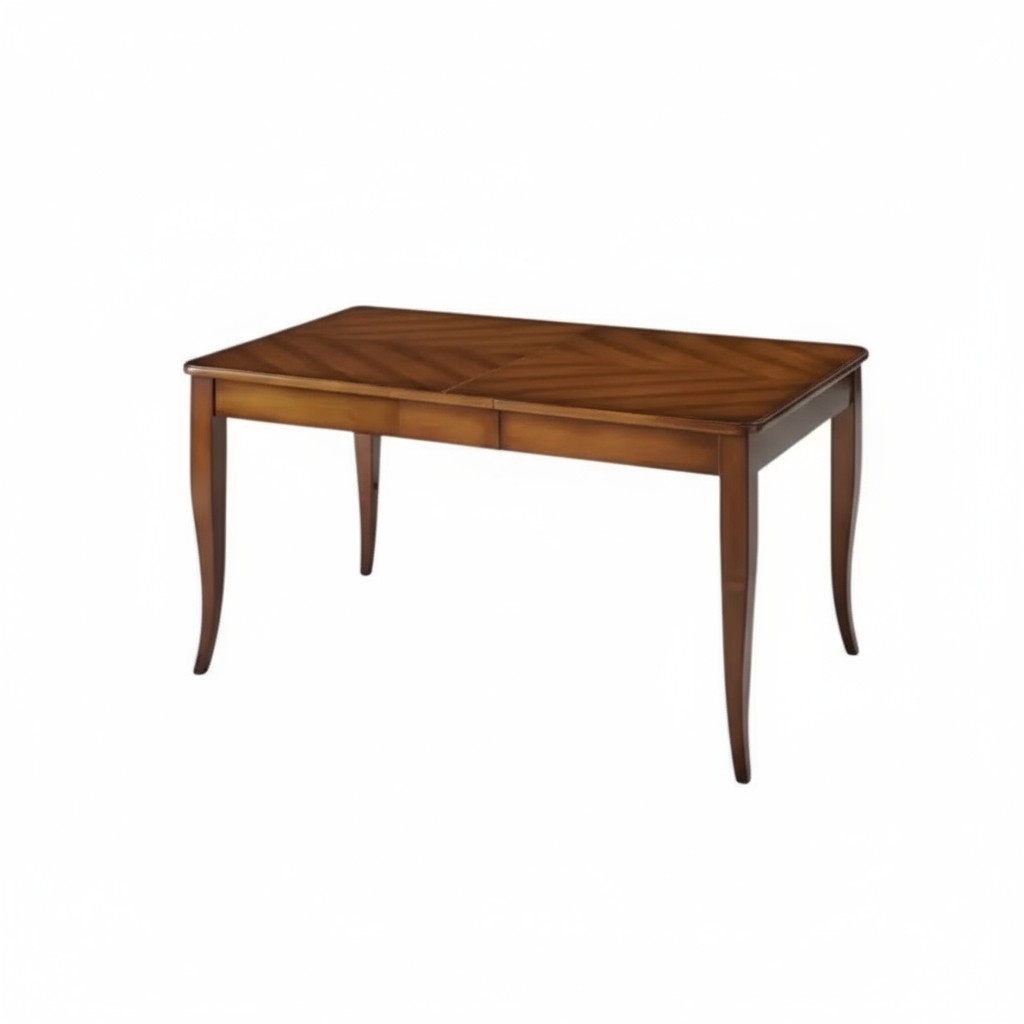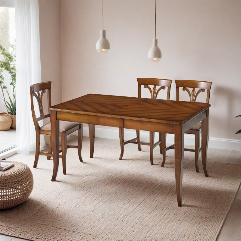 Tavolo rettangolare costruito in legno massello con gambe a sciabola sagomate e piano a spinapesce rendendo il mobile solido e allo stesso tempo elegante. Dotato di due allunghe da 45 cm allungabile con apertura centrale, detta anche 'apertura a scorrimento', le allunghe sono riposte sotto il piano. Ideale per il soggiorno e la cucina , un must intramontabile destinato a durare nel tempo e fuori dalle mode del presente.