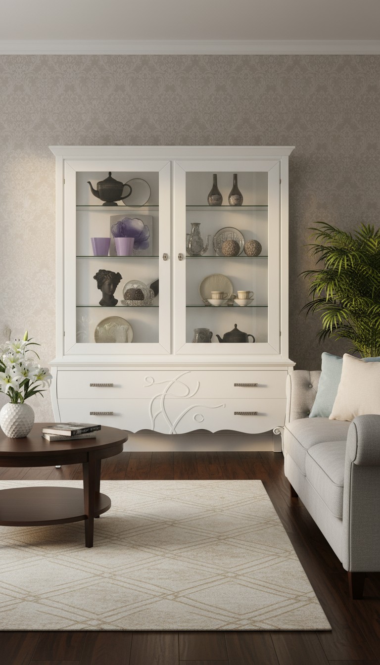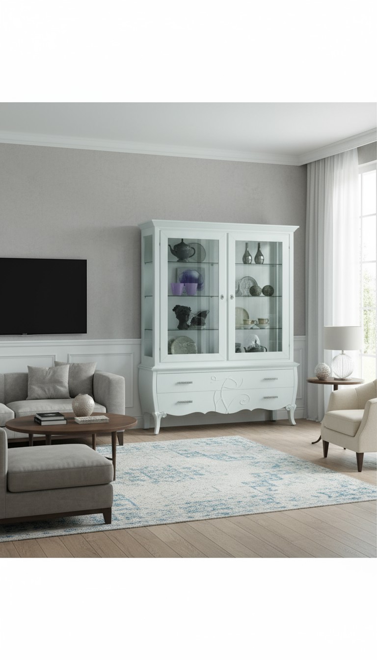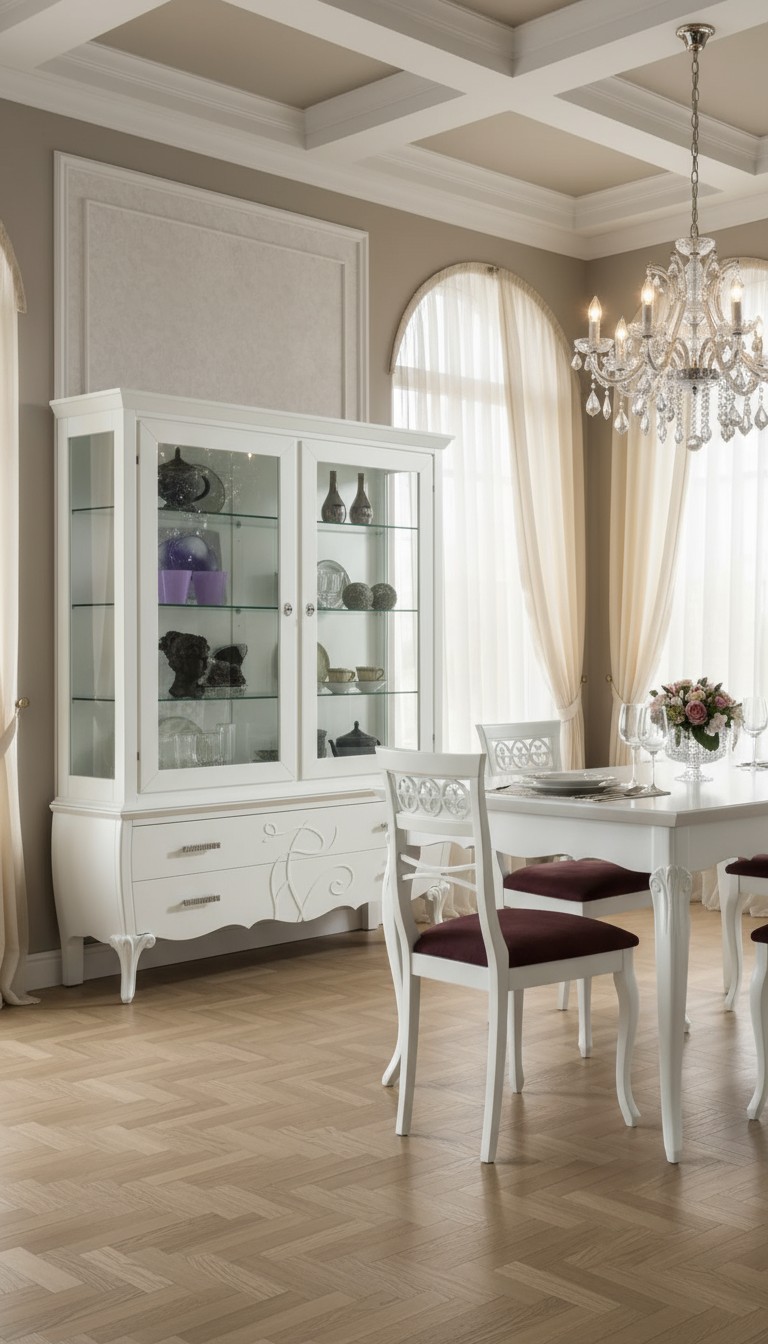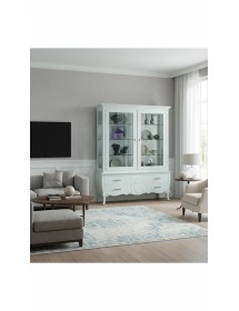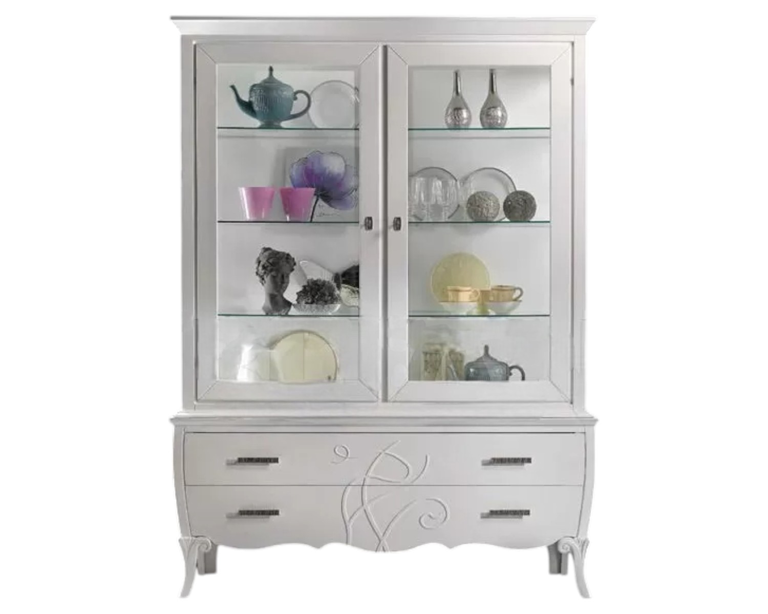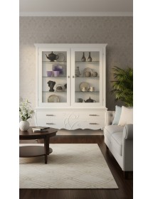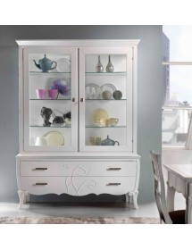 Cristalliera in stile shabby adatta per esporre i vostri oggetti preferiti risaltando tutto quanto esposto sui ripiani. Realizzata con uno stile classico per aggiungere un tocco di classe nella zona giorno o in taverna. Elemento d' arredo funzionale e spazioso che non passerà inosservato degli ospiti grazie alle sue linee sagomate e ai decori in rilievo sui due cassetti della base.