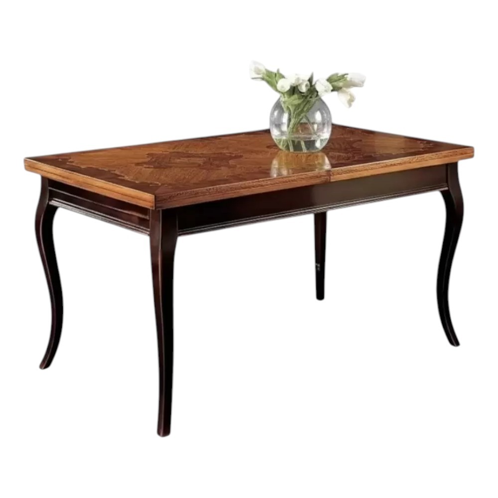 Tavolo costruito in legno massello con gambe sagomate rendendo il mobile elegante e unico nel suo genere. Dotato di 4 allunghe da 40 cm. allungabili al centro del tavolo. Ideale per il soggiorno o in cucina.