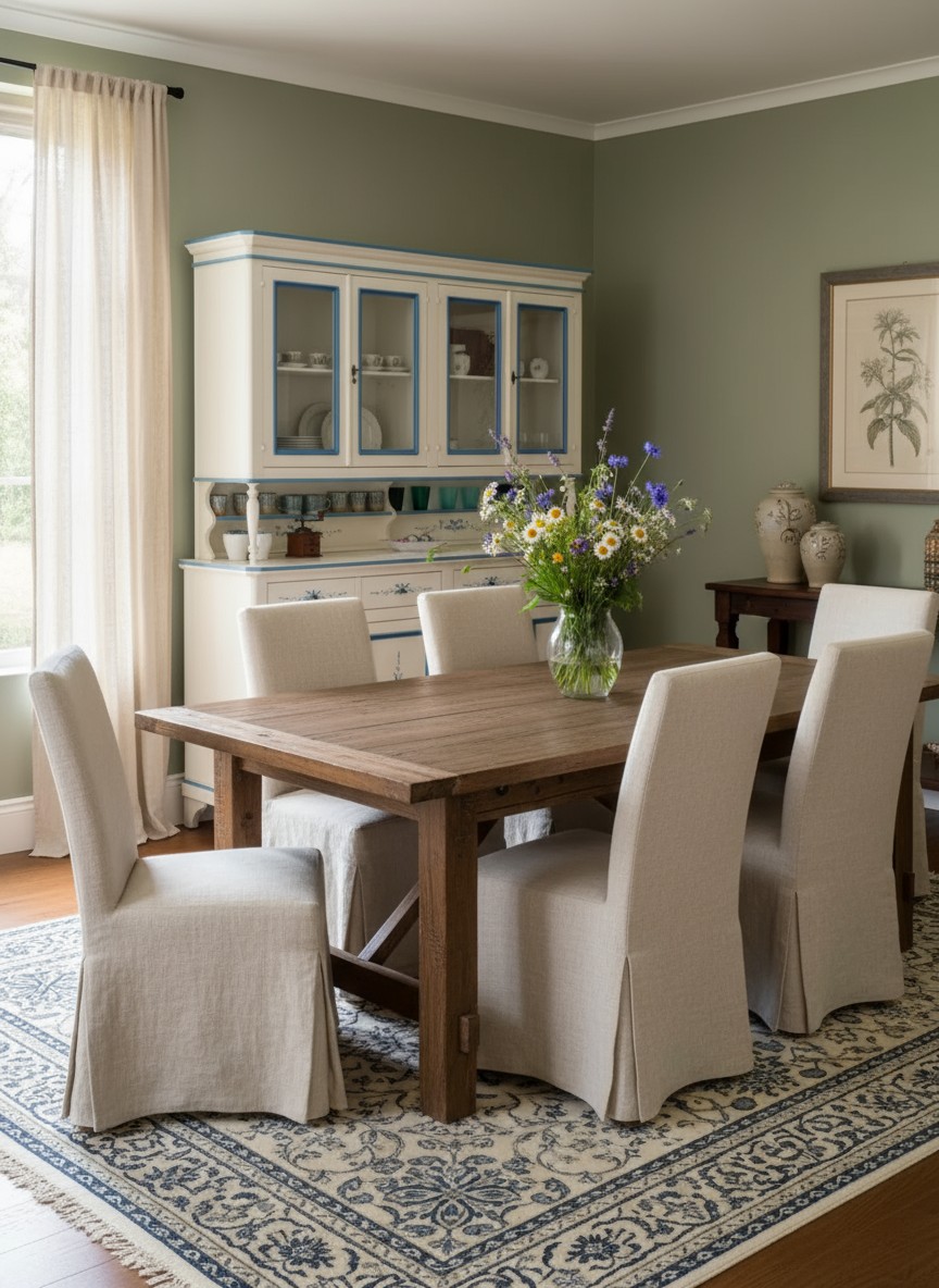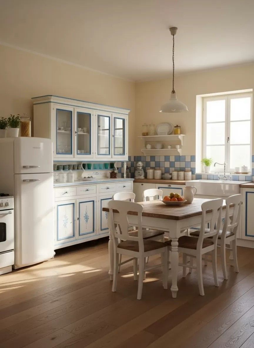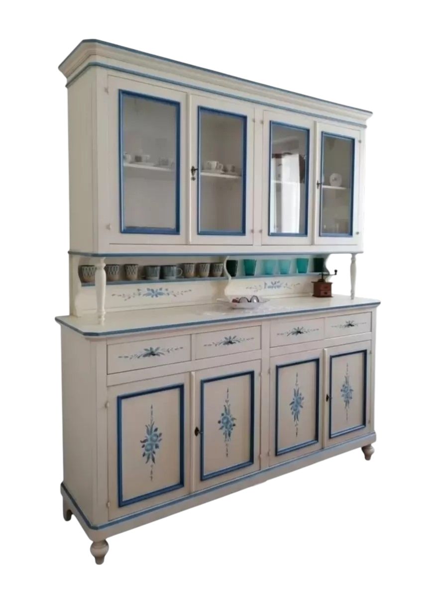 Cristalliera 4 porte legno shabby bianco anticato decori filo blu 198X43X210