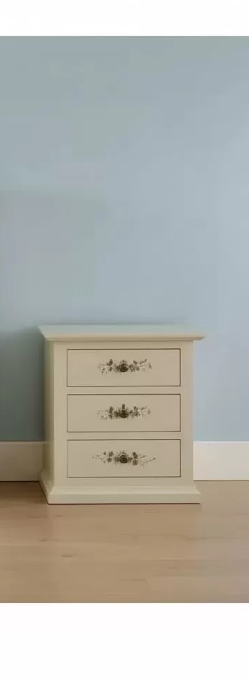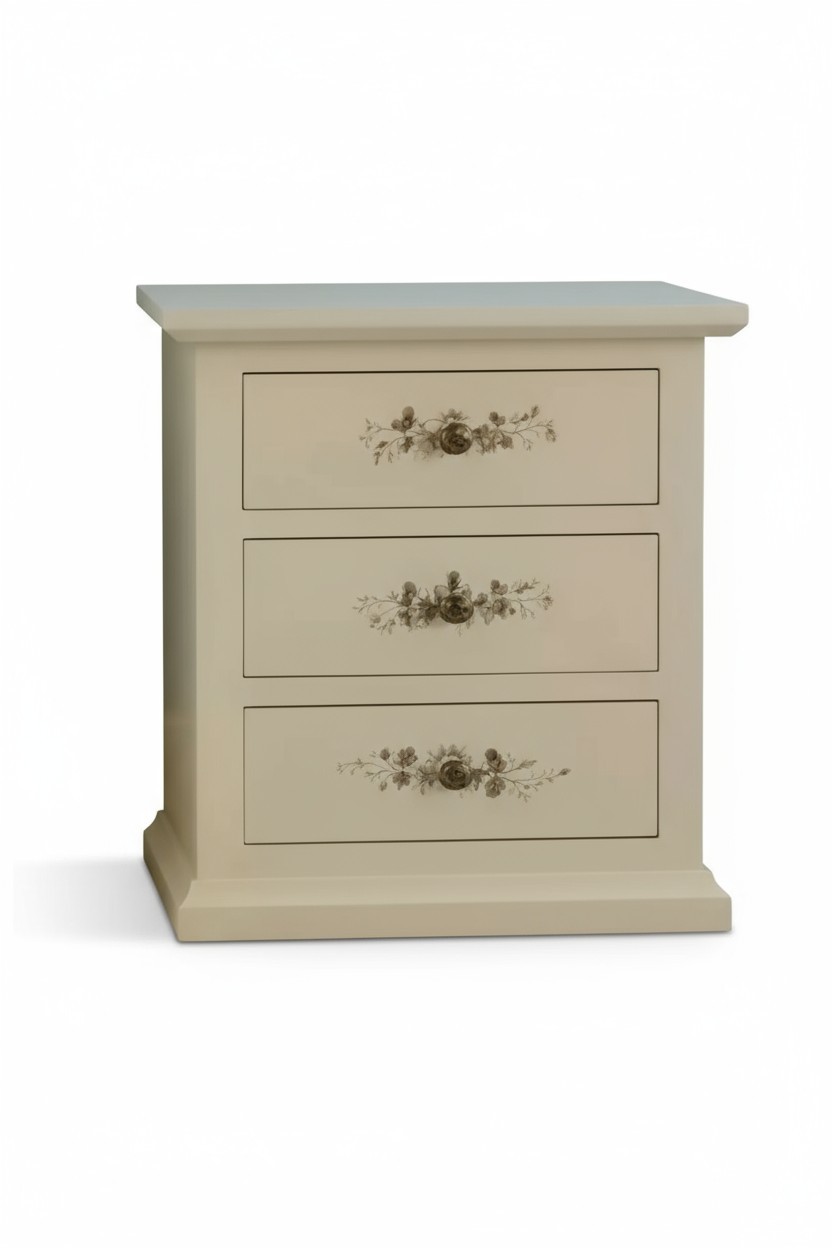 Comodino in stile shabby costruito in legno rendendo il mobile solido e allo stesso tempo elegante. Dotato di 3 cassetti con zoccolo a terra, Ideale per la zona giorno, per l'entrata per riporre il telefono o come comodino per la zona notte. Unica nel suo genere con i suoi decori floreali dando un tocco a un' atmosfera dallo stile d'altri tempi .