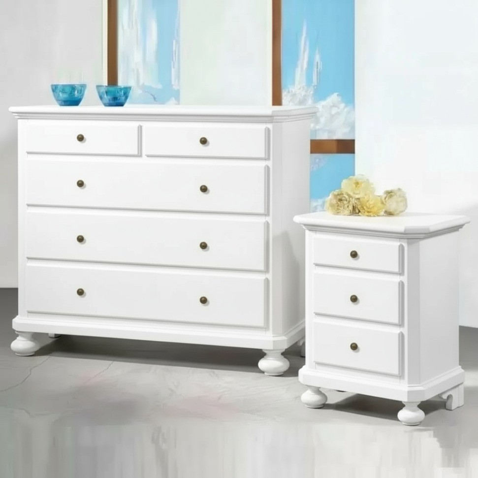Gruppo cassettiera e Comodini costruiti in legno con angoli smussati e gambe a cipolla. Cassettiera e comodini dotati di cassetti per riporre all'occorrenza biancheria intima e oggetti. Trovano facilmente posto nella zona notte proteggendo con i suoi cassetti il suo contenuto all'interno. Unici nel loro genere con la sue particolari gambe a cipolla e le sue linee classiche dando un tocco a un' atmosfera dallo stile d'altri tempi.