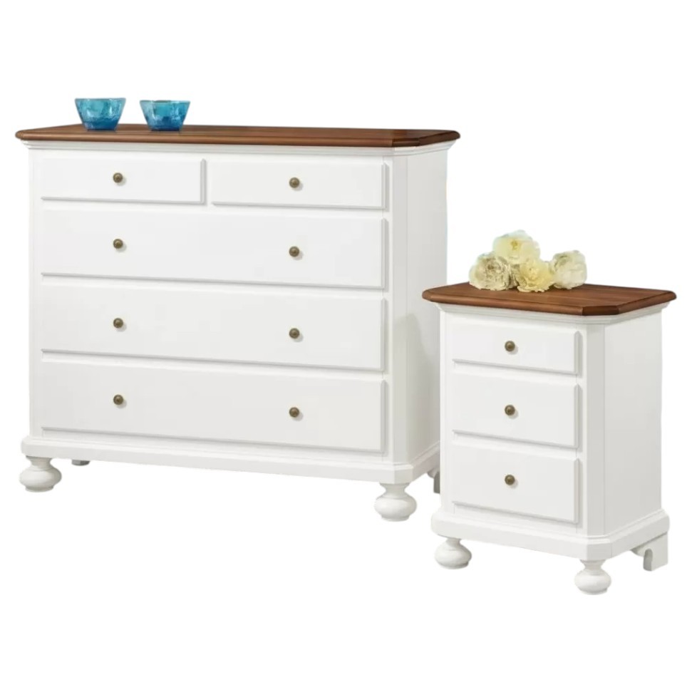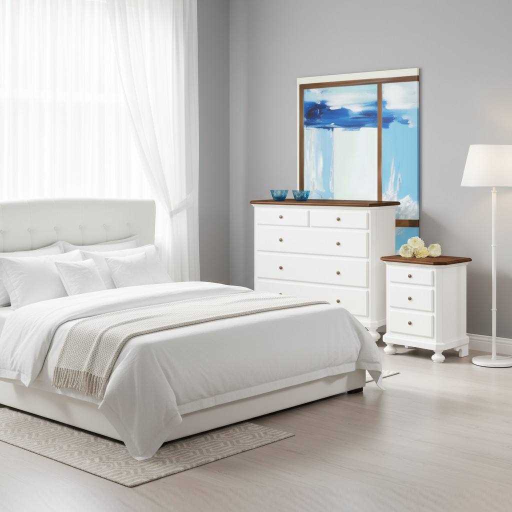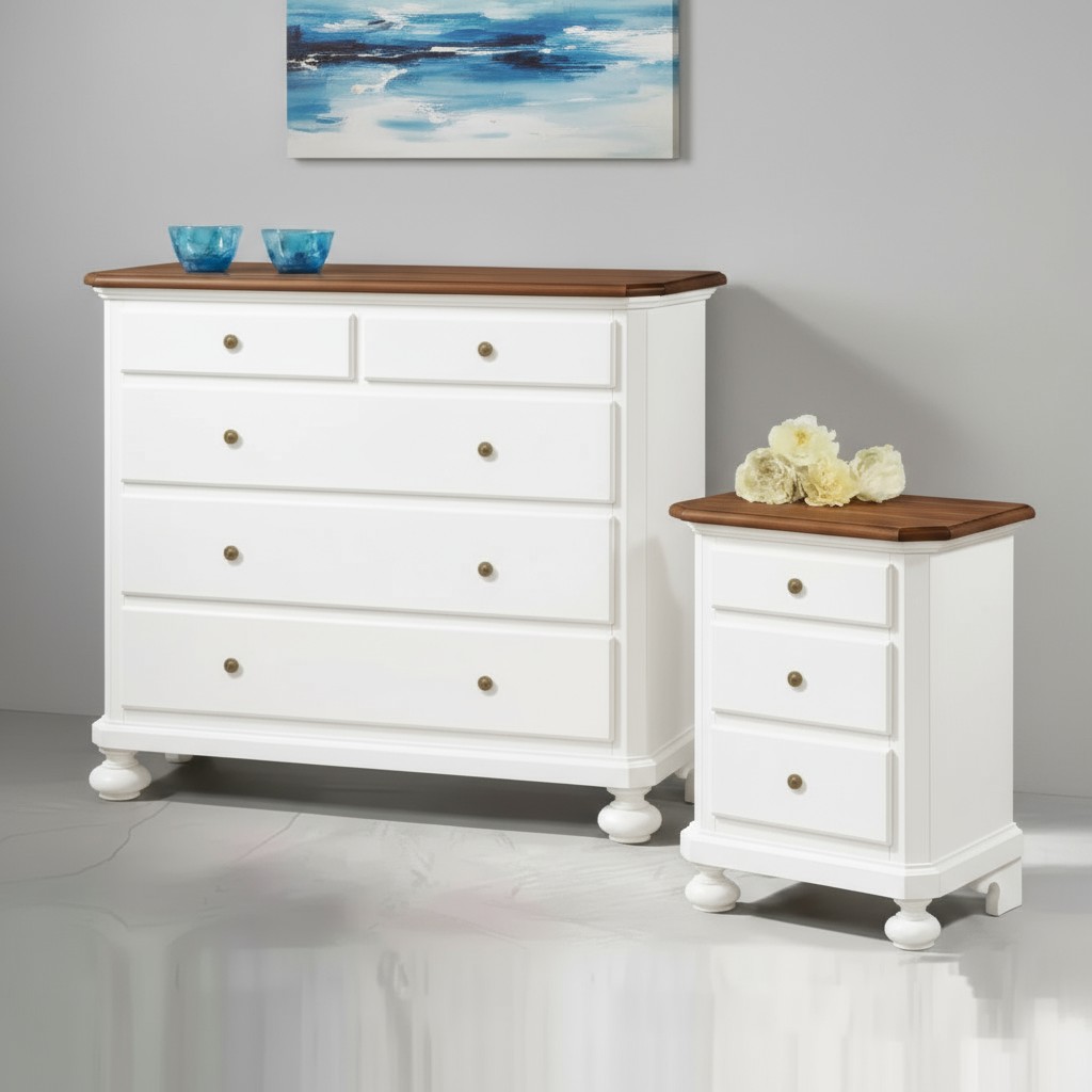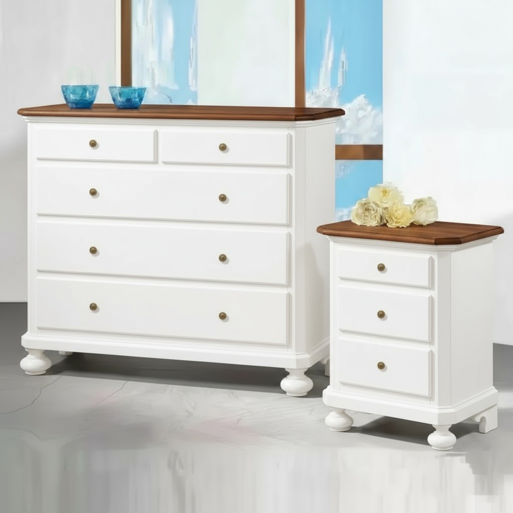 Gruppo 1 Cassettiera 2 Comodini legno bicolore bianco e noce