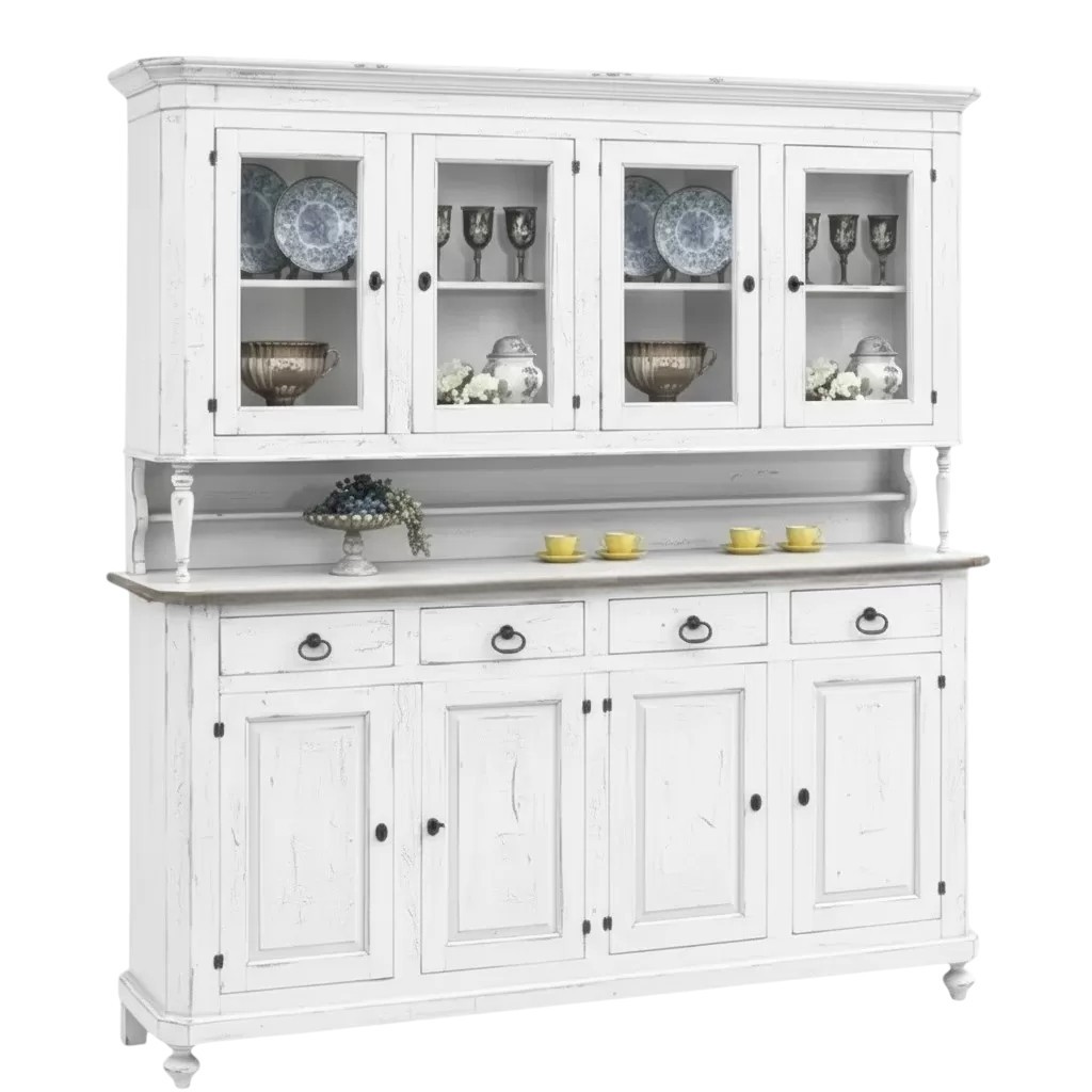Cristalliera in stile shabby elegante e con proporzioni perfette per qualsiasi stanza, adatta per contenere al suo interno stoviglie : bicchieri , piatti , tazze e servizi da the o caffè risaltando tutto quanto esposto sui ripiani. Elemento d' arredo adatto per salotti e nelle cucine, esteticamente appagante e allo stesso tempo funzionale e spazioso.