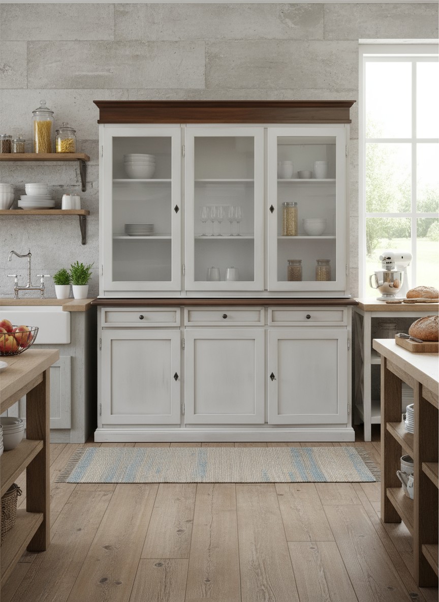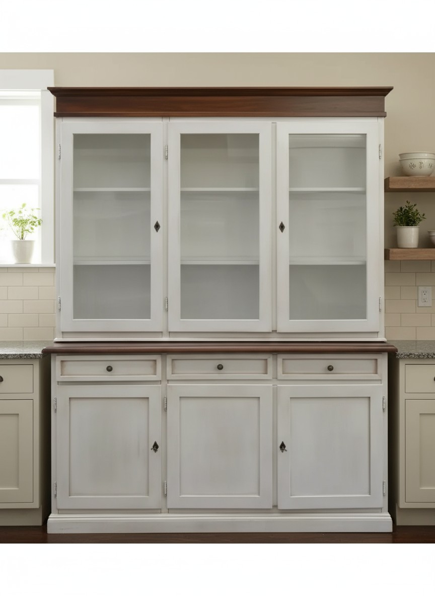 Cristalliera in arte povera shabby bianco elegante e con proporzioni perfette per qualsiasi stanza, adatta per contenere al suo interno stoviglie : bicchieri , piatti , tazze e servizi da the o caffè risaltando tutto quanto esposto sui ripiani. Elemento d' arredo adatto per salotti e nelle cucine, esteticamente appagante e allo stesso tempo funzionale e spazioso.