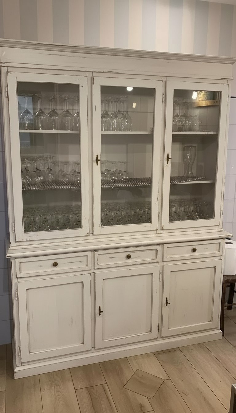 Cristalliera in stile shabby elegante e con proporzioni perfette per qualsiasi stanza, adatta per contenere al suo interno stoviglie : bicchieri , piatti , tazze e servizi da the o caffè risaltando tutto quanto esposto sui ripiani. Elemento d' arredo adatto per salotti e nelle cucine, esteticamente appagante e allo stesso tempo funzionale e spazioso.