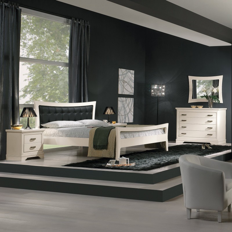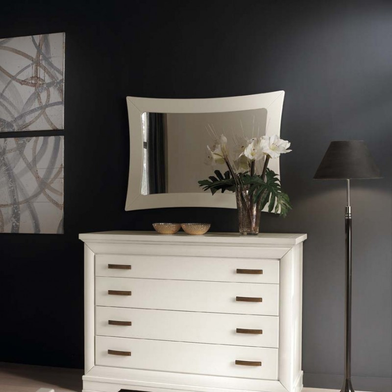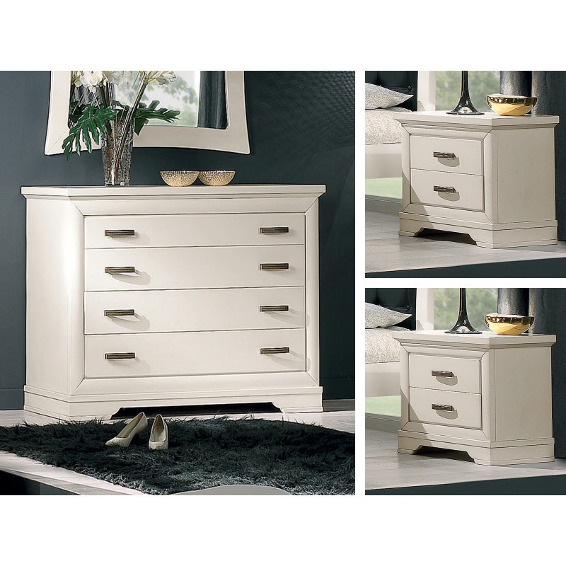 Gruppo cassettiera e Comodini costruiti in legno con fianchi stondati, con angoli a becco di civetta e zoccolo a terra sagomato. Cassettiera e comodini dotati di cassetti per riporre all'occorrenza biancheria intima e oggetti. Trovano facilmente posto nella zona notte proteggendo con i suoi cassetti il suo contenuto all'interno. Unici nel loro genere con la sua particolare laccatura bianca dando un tocco a un' atmosfera dallo stile romantico.