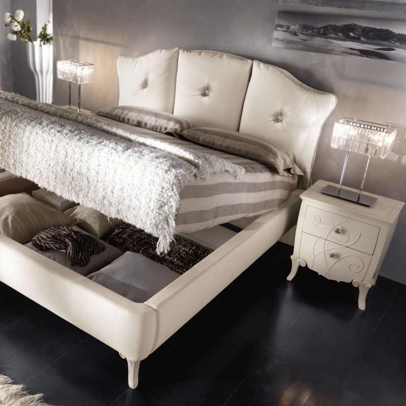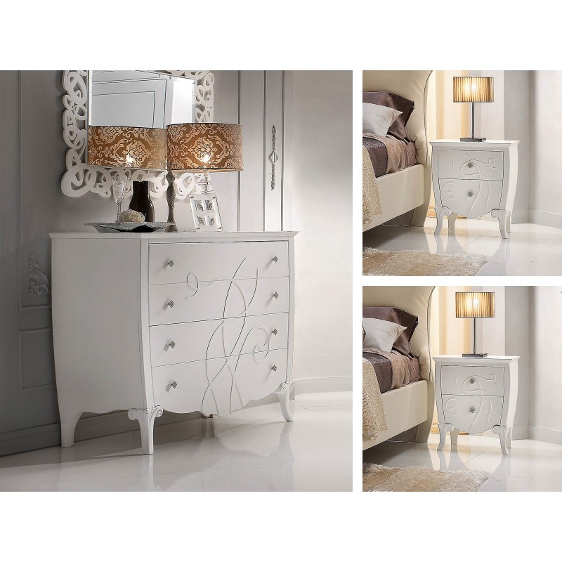 Gruppo cassettiera e Comodini costruiti in legno con fianchi stondati, con angoli a becco di civetta e zoccolo a terra sagomato. Cassettiera e comodini dotati di cassetti per riporre all'occorrenza biancheria intima e oggetti. Trovano facilmente posto nella zona notte proteggendo con i suoi cassetti il suo contenuto all'interno. Unici nel loro genere con la sua particolare laccatura bianca con decori in rilievo dando un tocco a un' atmosfera dallo stile romantico.